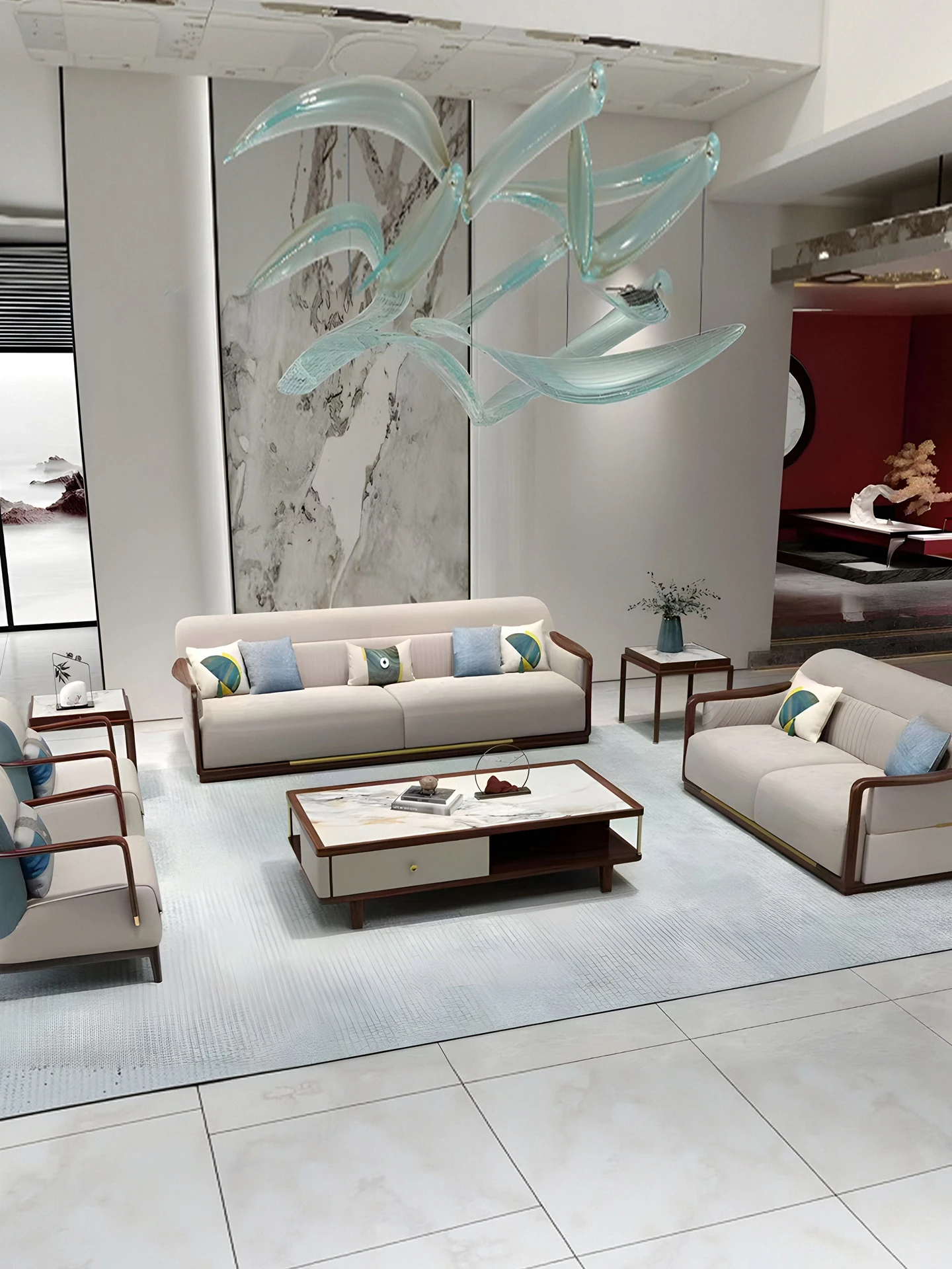 ホテルロビーの応接エリアに最適!美容院や店舗、モデルルームにぴったりな高級感あふれる岩板使用の小茶テーブル、洽談ソファ、丸テーブルのコンビネーションでお客様をお迎えします。