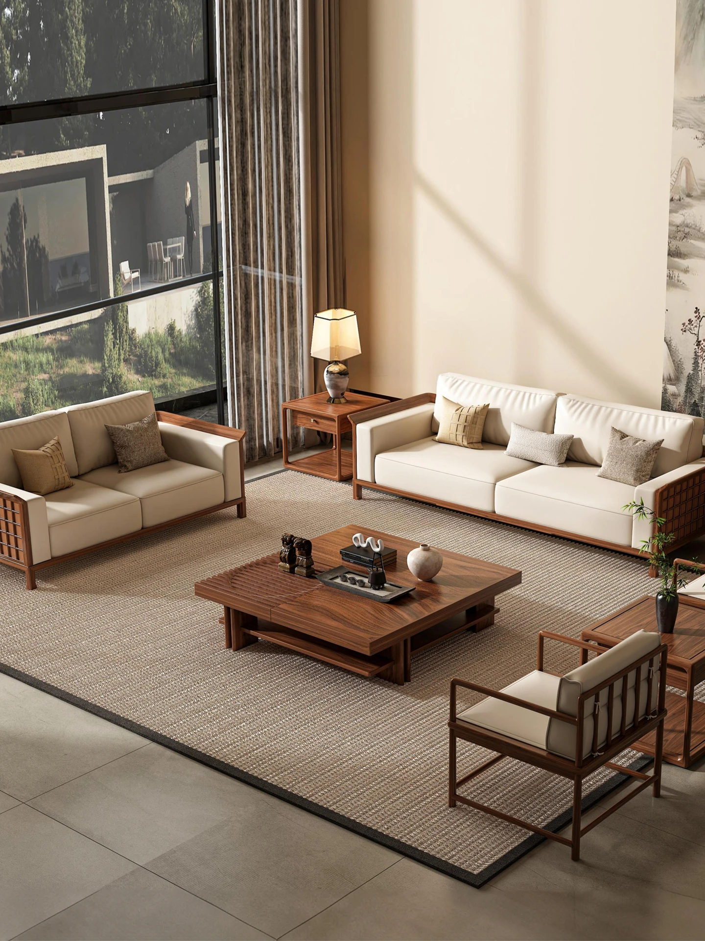 宋式スタイルの無垢材ソファセット - 別荘リビングにぴったりの禅の雰囲気、最新の北米ブラックウォールナットと本革を使用した高級ソファ。心地よい安らぎを提供します!