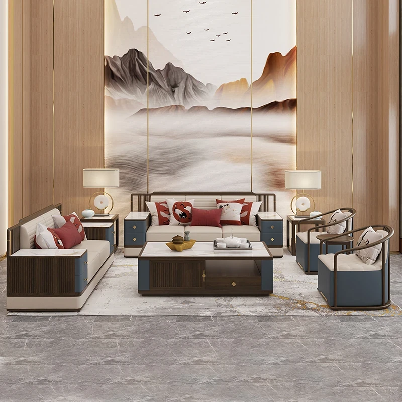 新中式高級実木ソファセット - モダンでシンプルな客間にぴったり!ウッディなウキン材使用、豪華な本革仕上げ、別荘や高級住宅に最適なスタイル。快適さと美しさを兼ね備えた一品です!