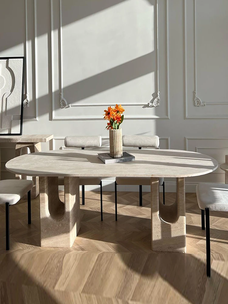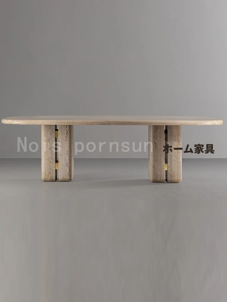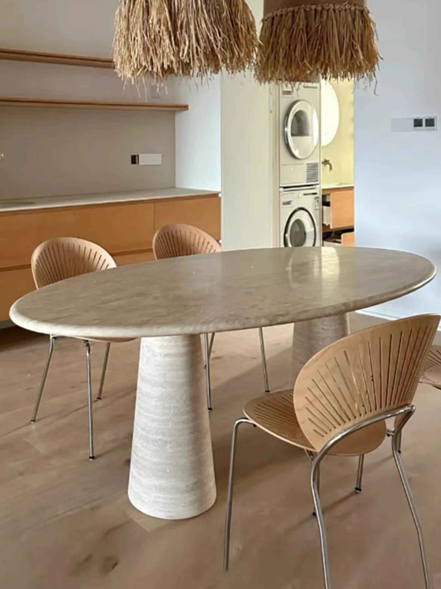 侘寂風インポート天然洞石ダイニングテーブル|デザイナーズ家庭用小型レストラン向けエレガントな楕円形食卓|洽談やおもてなしに最適!