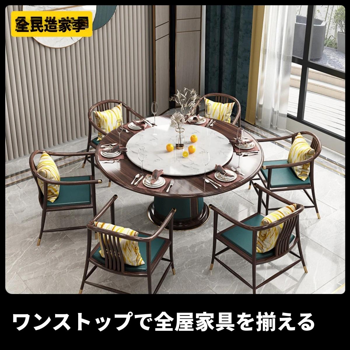 新中式ウコン木製ダイニングテーブルセット|ラグジュアリーな円形デザイン|現代的な大理石仕上げ|別荘や広々としたリビングに最適な家庭用テーブル|高級感溢れるスタイルで食事を楽しむ!