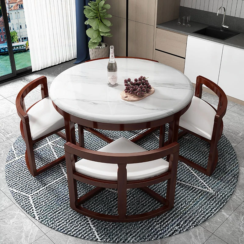モダンでシンプルな大理石ダイニングテーブルセット - 小型住宅に最適!実木製で省スペース、4脚の椅子付きの円形テーブル。おしゃれな食事空間を演出します!