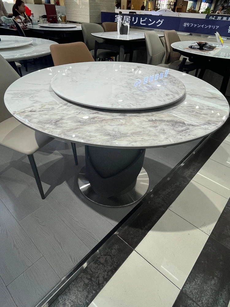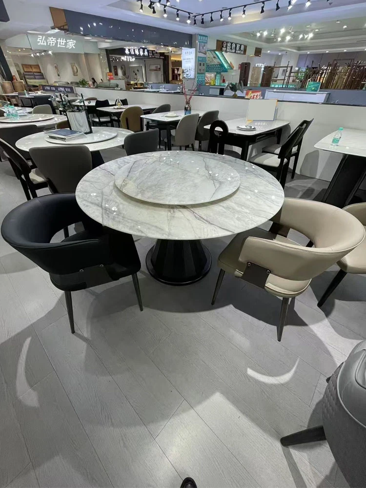 天然大理石の透過性を持つ現代的な円形ダイニングテーブルセット - シンプルで洗練されたデザイン、家族団らんや特別な場面に最適!おしゃれな回転テーブルで食事を楽しむ新しいスタイル。