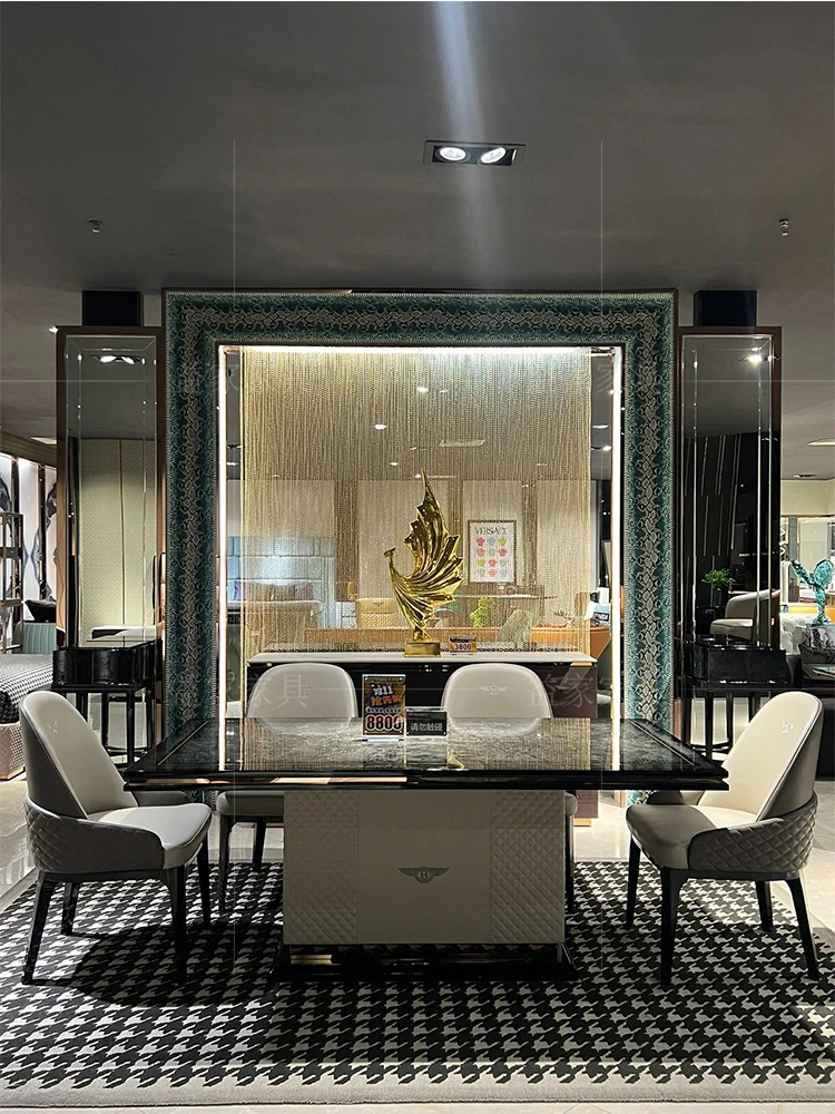 ベントレー風イタリアンラグジュアリー スチール仕上げの長方形ダイニングテーブルセット - モダンミニマリズム、ヴィラにもぴったりなデザイナーズテーブルとチェア!高品質ステンレスで耐久性抜群、洗練された空間を演出します。
