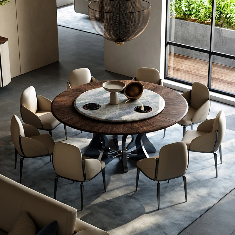 輸入品の大理石製ラウンドダイニングテーブルとチェアセット - 高級ヴィラ向けの新デザイン、電動式のモダンイタリアンミニマリズムが光るラウンドテーブル!贅沢な食事空間を演出します。