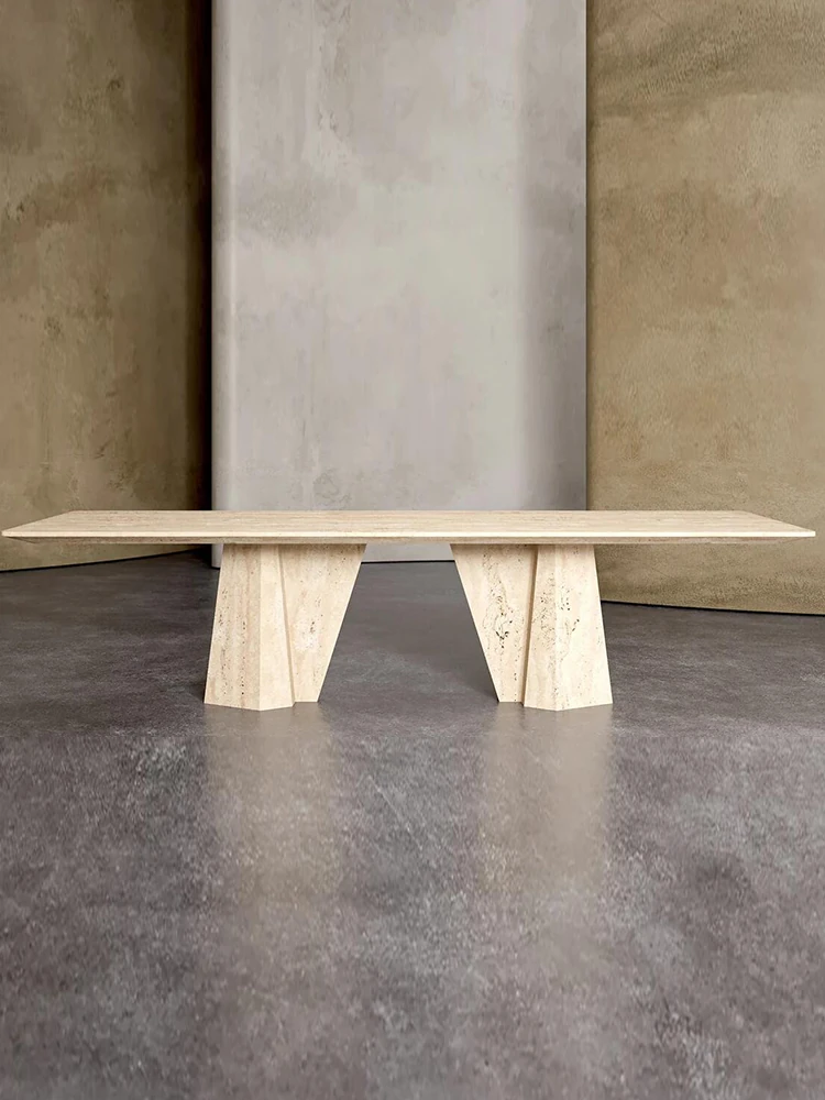 北欧風のシンプルでラグジュアリーな天然洞石長方形ダイニングテーブル - 侘寂美学を取り入れたデザイナーズヴィラ用、上質な雰囲気を演出する一品。