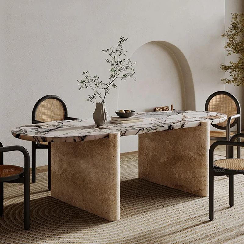 天然大理石製のエレガントなオーバルダイニングテーブル - ミニマリストとヴィンテージの融合、モダンな宿泊施設にもぴったり!洗練されたデザインで特別な食卓を演出します。