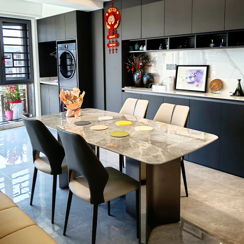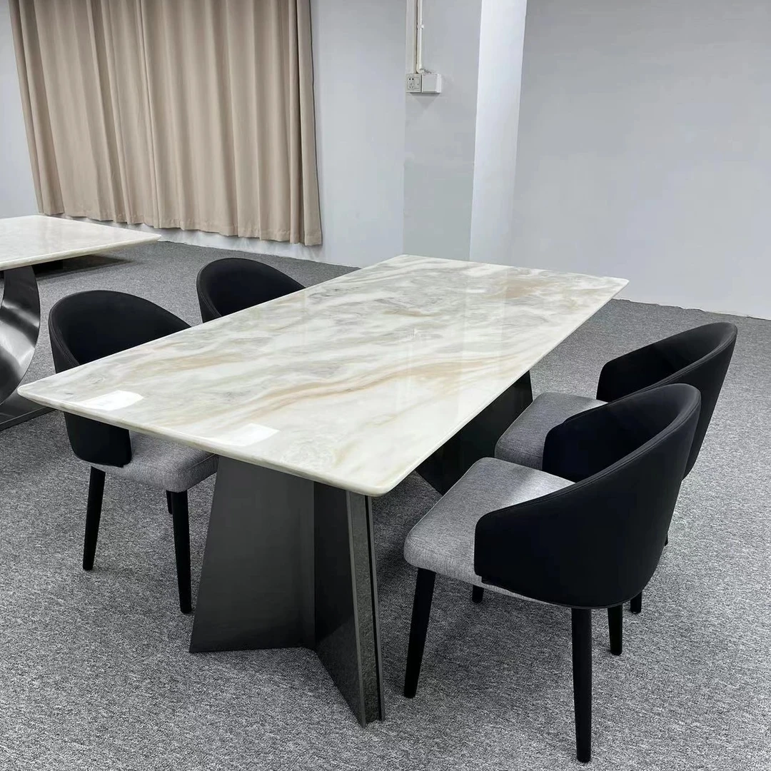 実店舗品質のミラノアイスジャスパー大理石を使用した贅沢なモダン長方形ダイニングテーブル。シンプルで洗練されたデザインが魅力の家庭用リビングダイニングセット。