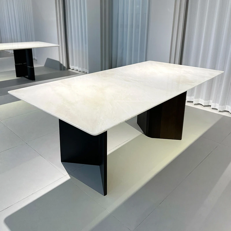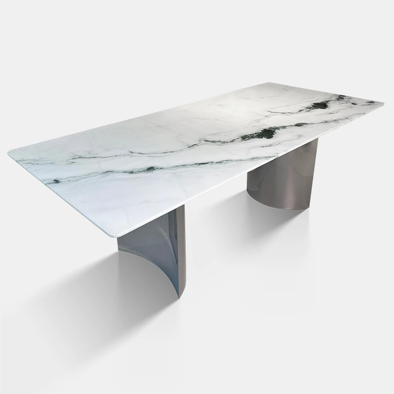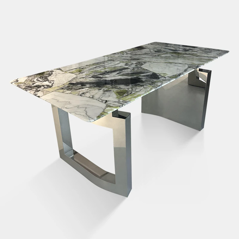 イタリアンミニマリズムの大理石高級ダイニングテーブル|ラグジュアリーなリビングにぴったり!天然カルイアイスジェードの長方形デザインで、エレガントな食事空間を演出します。