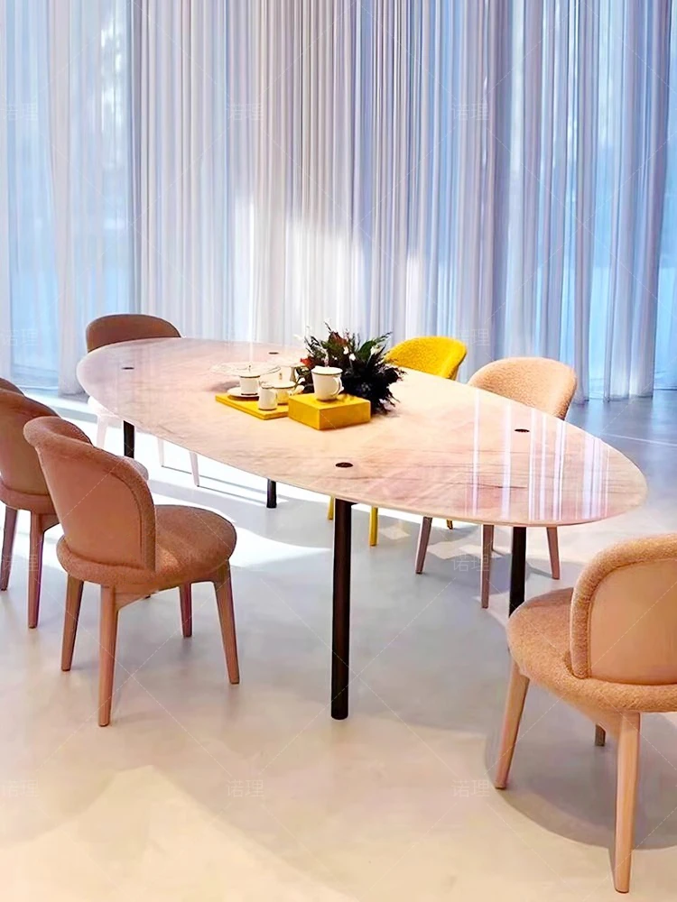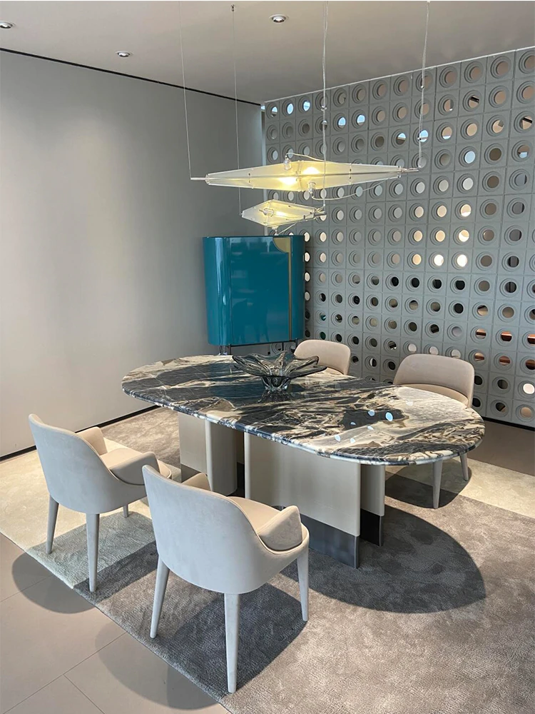 イタリアンラグジュアリー天然石ダイニングテーブル&チェアセット、エレガントなオーバルデザインのクリエイティブなロックプレート、洗練されたレストランスタイルの食卓。