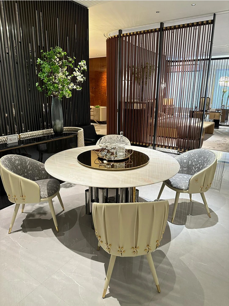 天然ブルーサンド円形ダイニングテーブル - 高級デザイン、ラグジュアリーな石材使用、洗練された大平层別荘にぴったりなテーブル&チェアセット、ミニマルな美しさを追求。