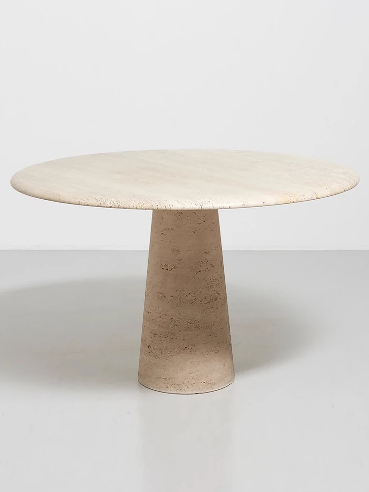 侘寂風の軽やかな高級感!北欧スタイルのミニマリストデザイン、天然ローマ洞石のラウンドダイニングテーブル。小さなスペースにぴったりな、創造的で洗練された食卓をお楽しみください。
