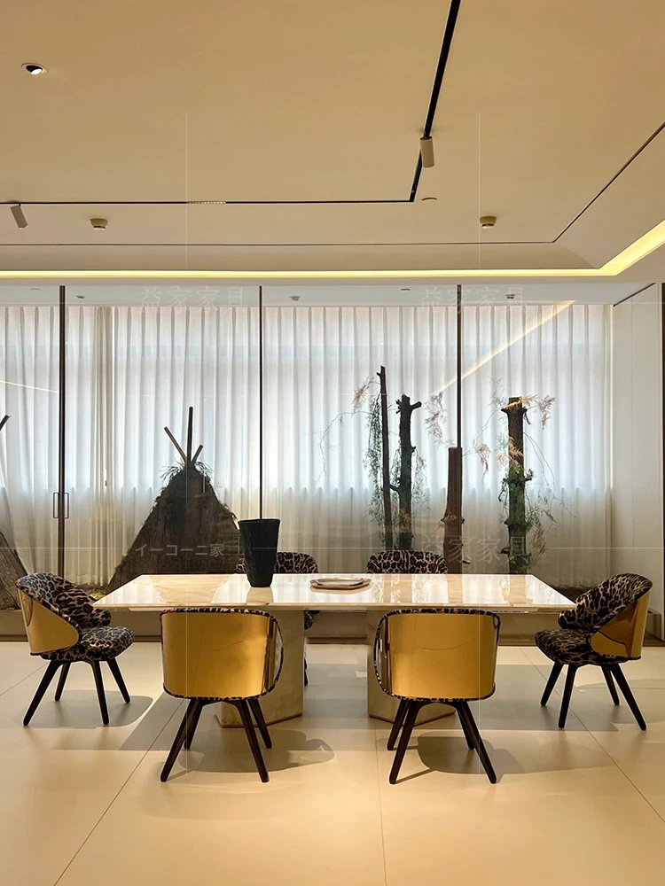 イタリアンラグジュアリー大理石長方形ダイニングテーブル&レオパード柄ビンテージソファチェア・スタイリッシュな書斎チェア・広々とした平面別荘デザインに最適!