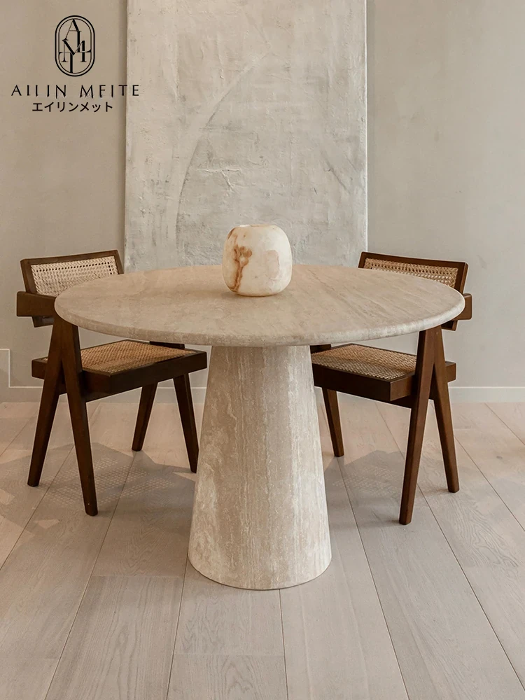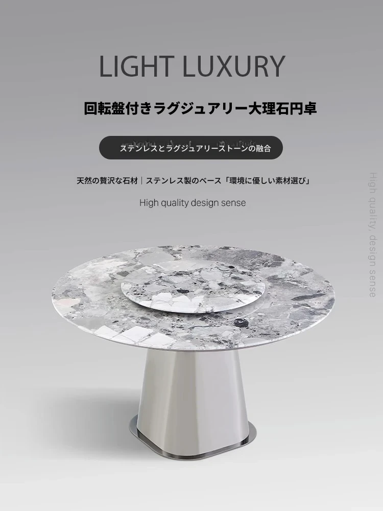 侘寂風の軽やかな贅沢感!天然石を使用した北欧風のシンプルな丸型ダイニングテーブル。小さなお部屋にもぴったりな大理石のクリエイティブデザインで、おしゃれな食卓を演出します。