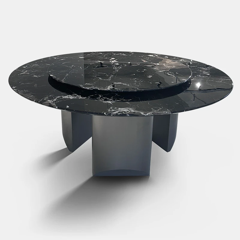 天然ブルーサンド円形ダイニングテーブル - 高級デザイン、ラグジュアリーな石材使用、洗練された大平层別荘にぴったりなテーブル&チェアセット、ミニマルな美しさを追求。