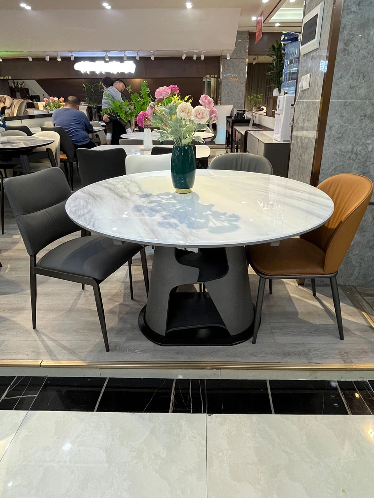 広東佛山産インポートブラックウォールナット円形テーブル - 天然大理石の豪華な天板を持つ本格的な木製ダイニングテーブルと椅子セット。家族や友人との特別なひとときを演出します。