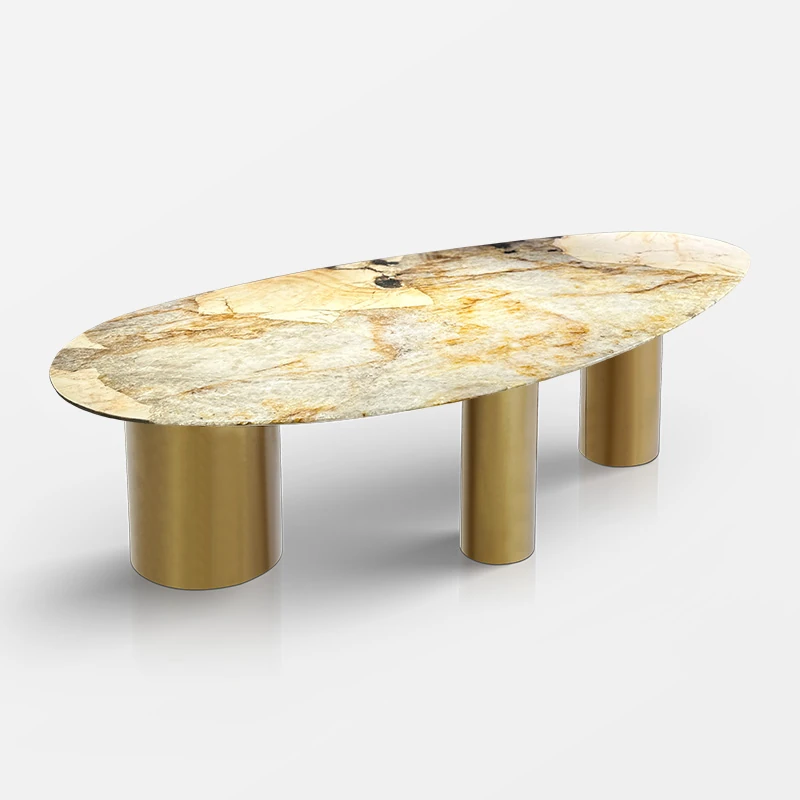 レトロシックな天然石のダイニングテーブル - フランス風のライトラグジュアリーでミニマルなデザイン、エレガントな楕円形の大理石テーブル。ヴィラの食卓にぴったりな高級感あふれるアイテムです。