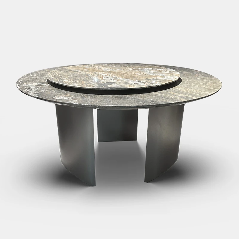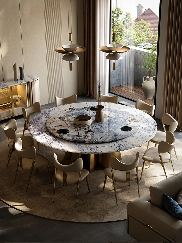 イタリアンラグジュアリー天然石ラウンドダイニングテーブル - 回転式電磁調理器付き、別荘にぴったりのスタイリッシュなテーブルセット!優雅なデザインで、食事のひとときを特別に演出します。