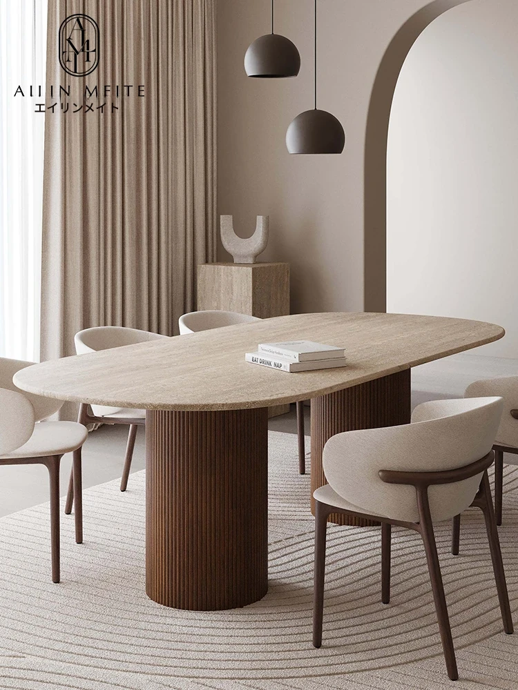 ノリNOL北欧ミッドセンチュリー風天然洞石モダンシンプル侘寂スタイル高級デザイナーマーブルダイニングテーブル - あなたの食卓に上質な美を。