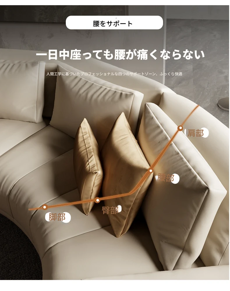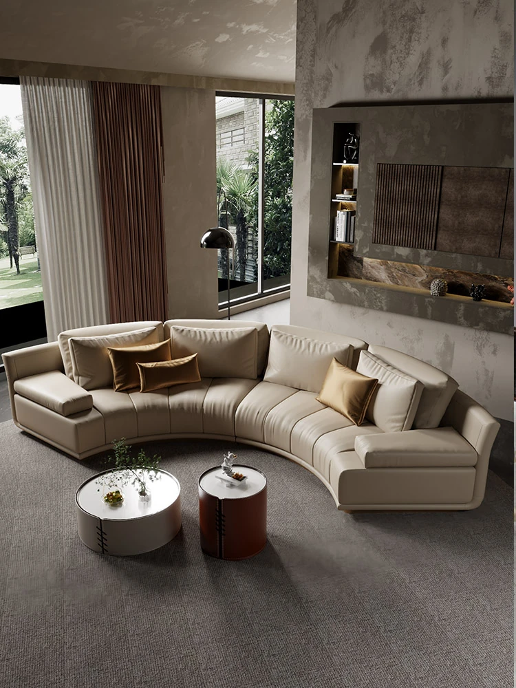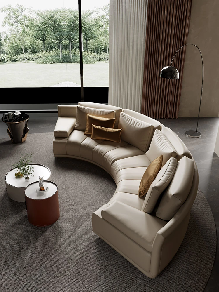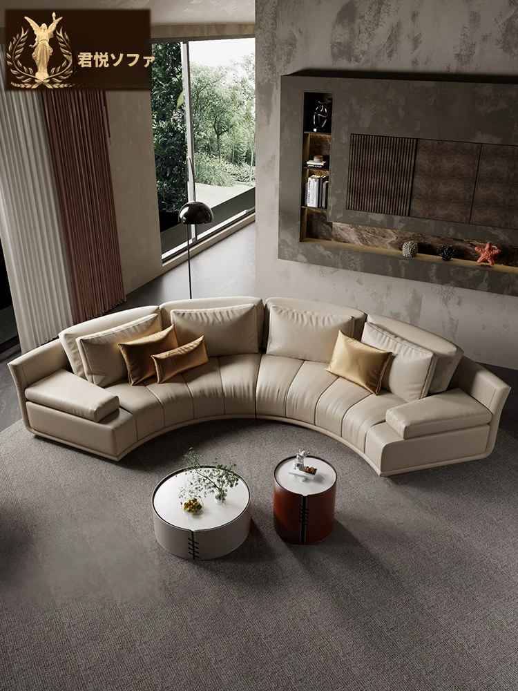 アーチ型本革ソファ|イタリアンミニマリズムの洗練されたデザイン|高級感あふれるリビングルームのためのオリジナル作品|軽やかなラグジュアリーを実現!