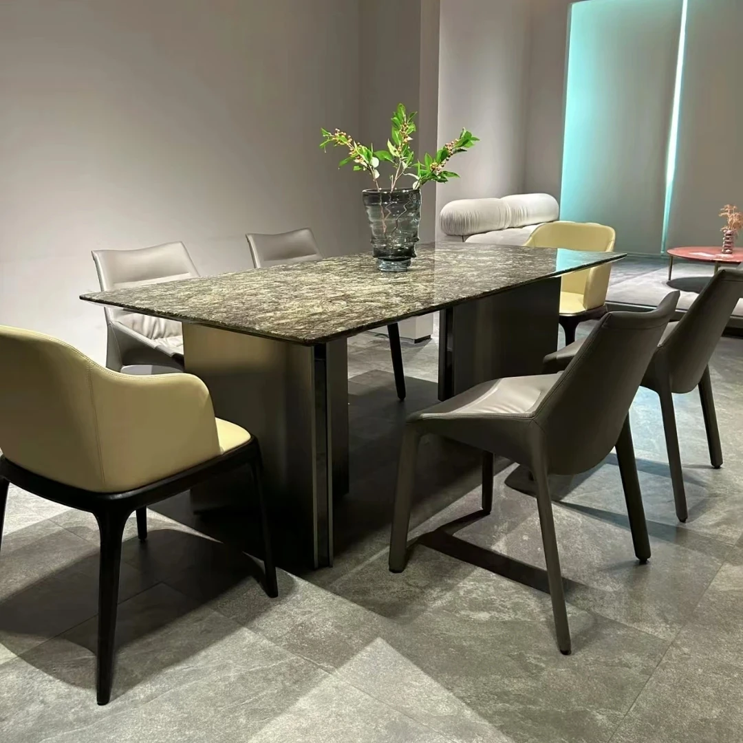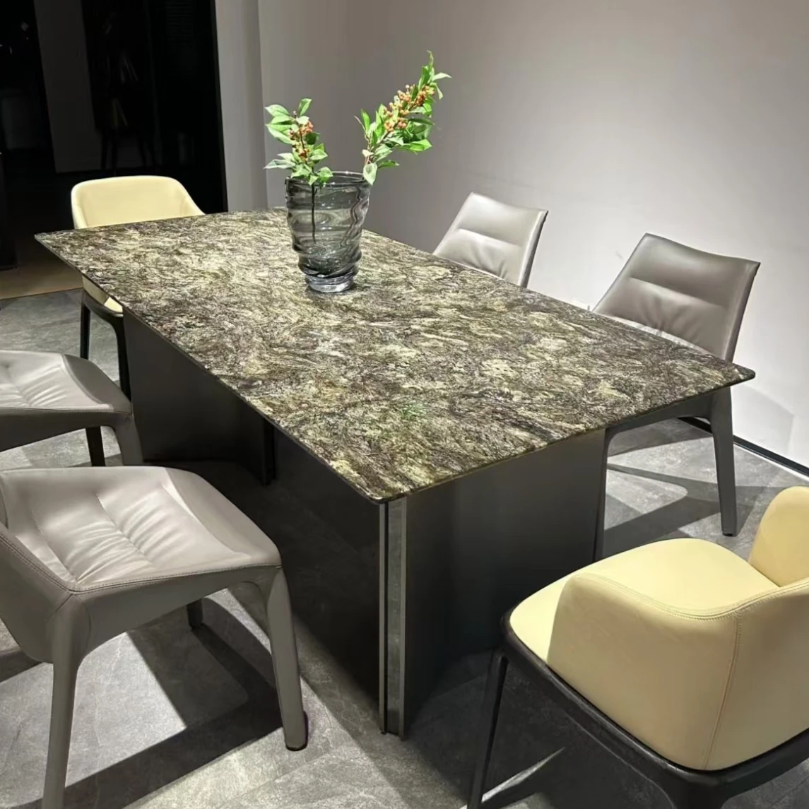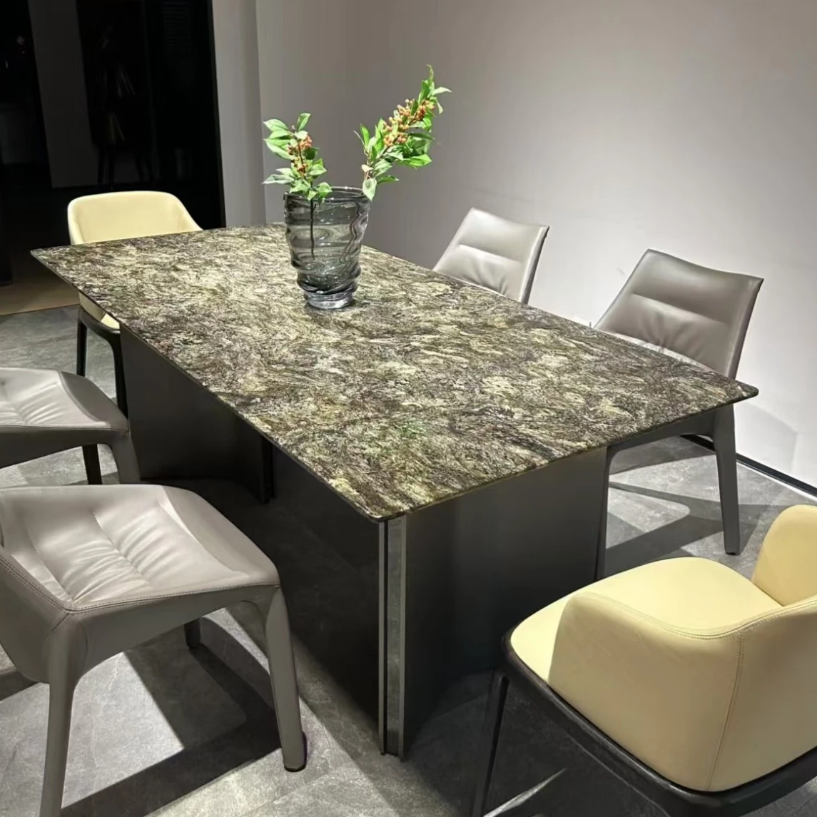 実店舗品質のイタリアンミニマルデザイン、プラチナダイヤモンド仕上げの天然大理石長方形ダイニングテーブル&チェアセット。洗練された美しさと耐久性を兼ね備えた贅沢な食卓で、特別なひとときをお楽しみください。