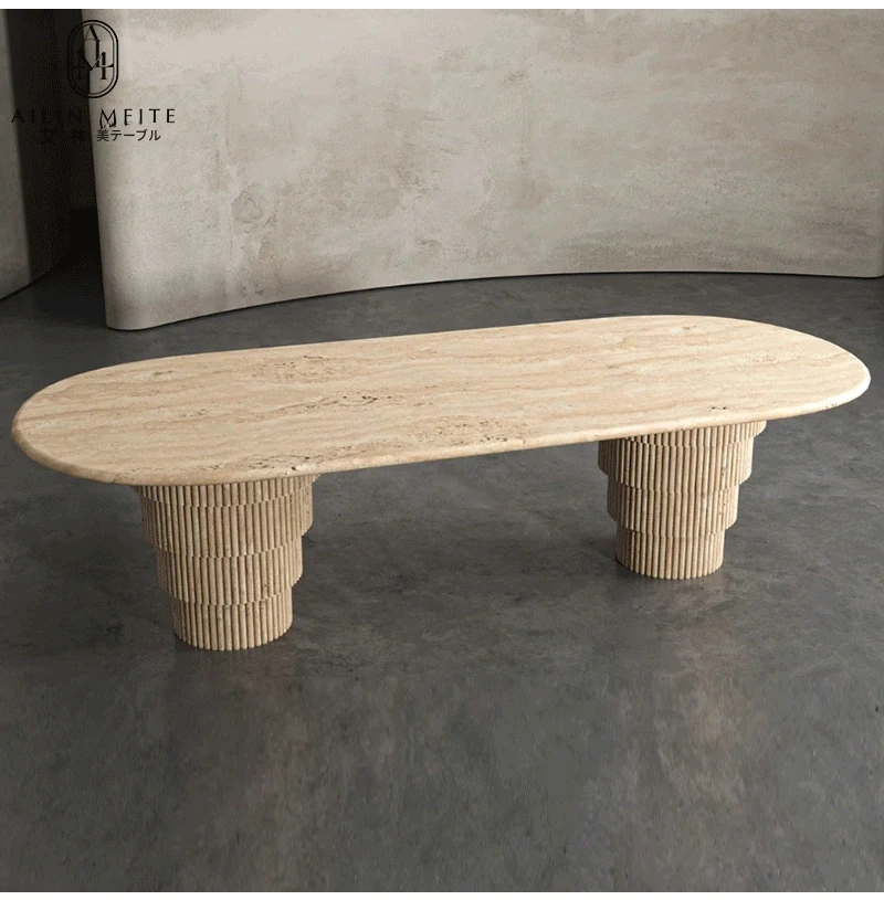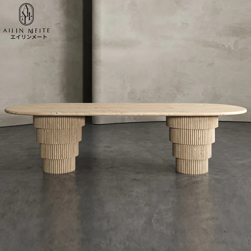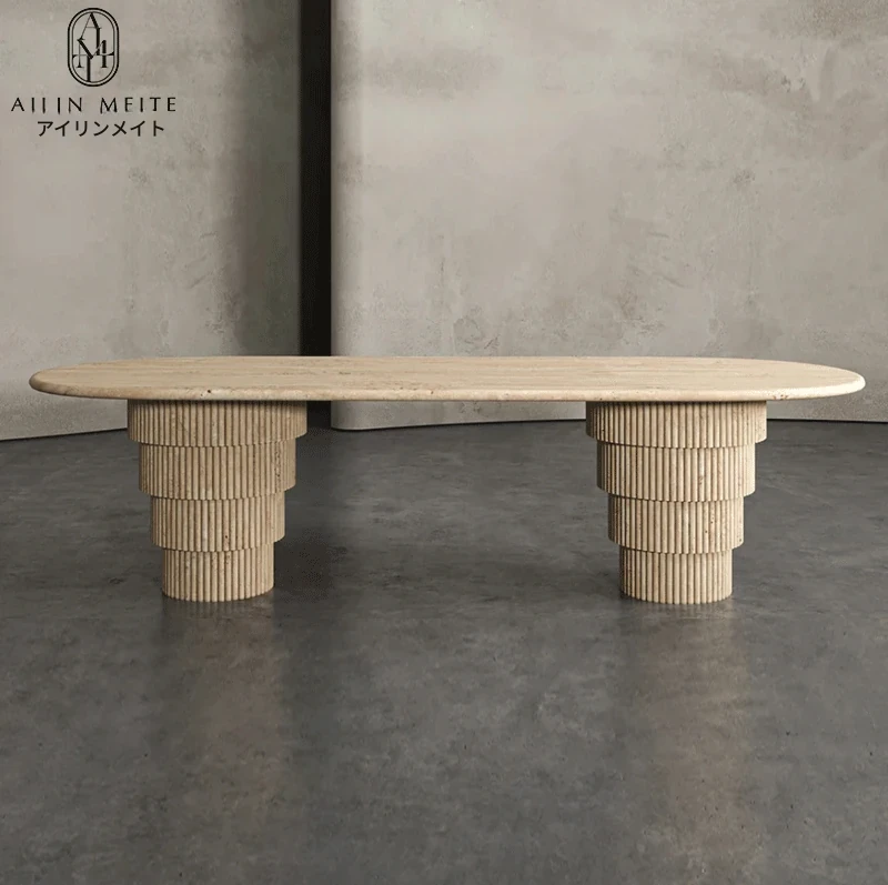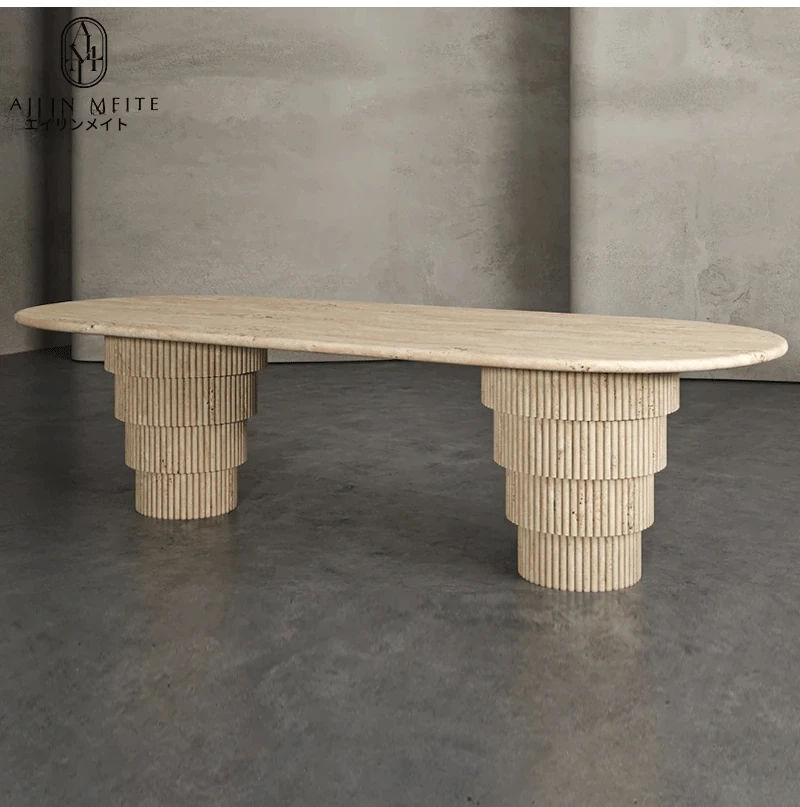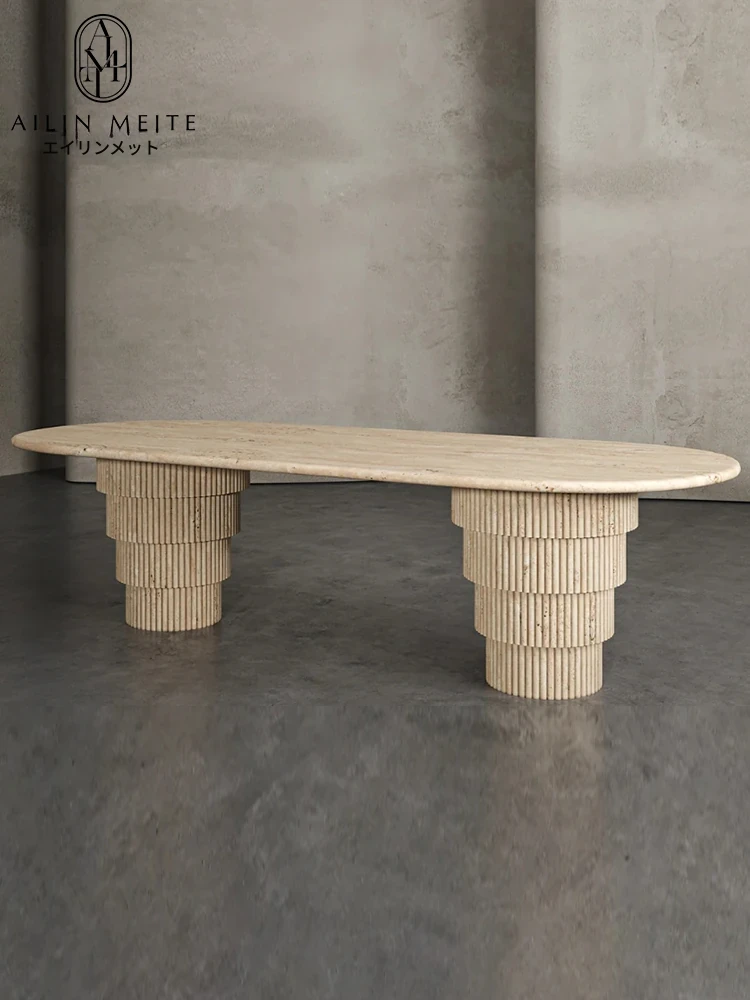 侘寂風を感じる天然洞石のダイニングテーブル - デザイナーズモデル、ホテルや別荘にぴったりの高級感あふれる楕円形のロングテーブル。優雅な食卓で特別なひとときを演出します。