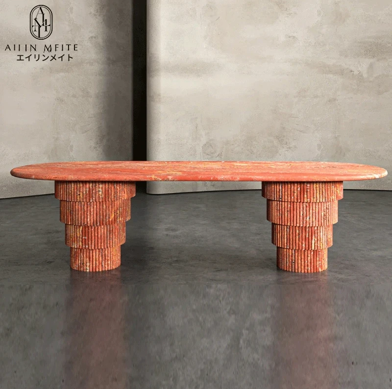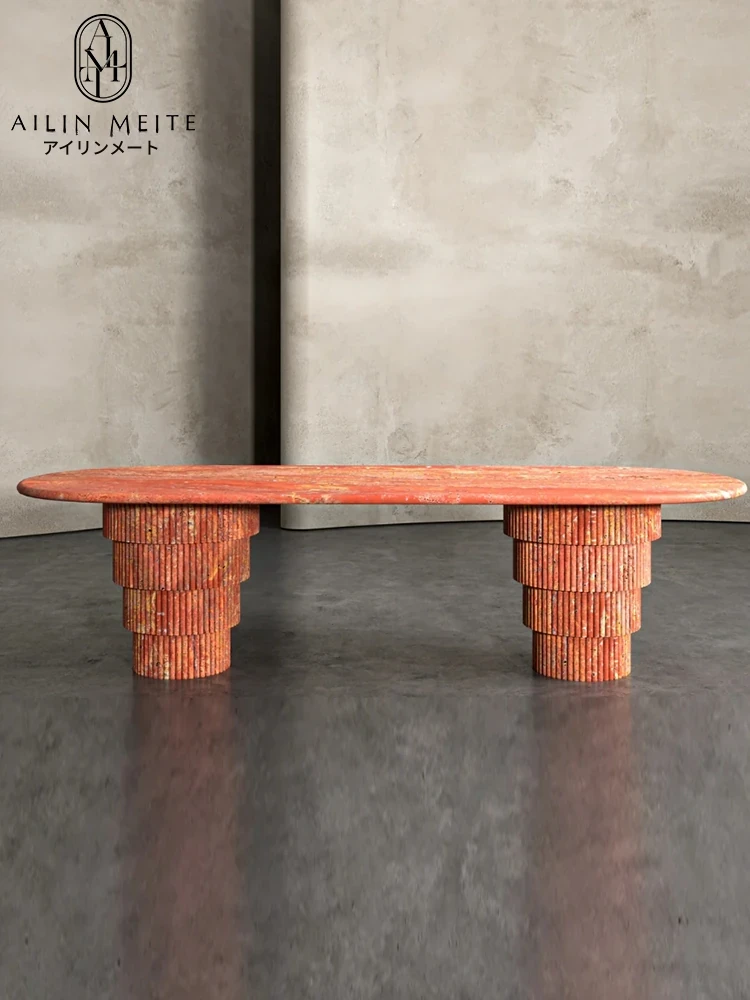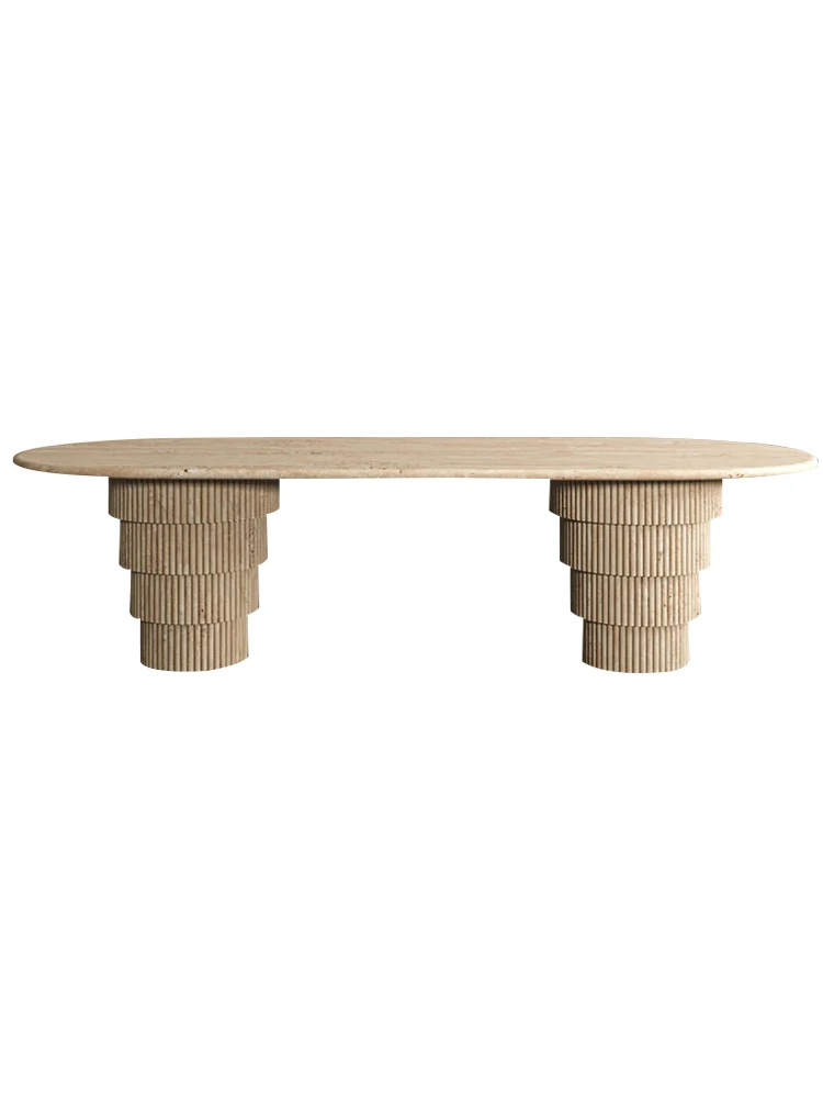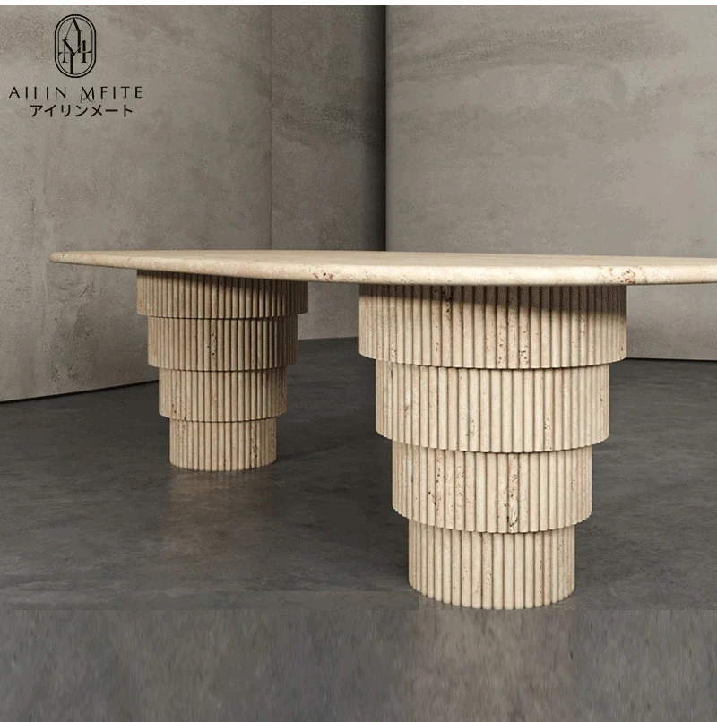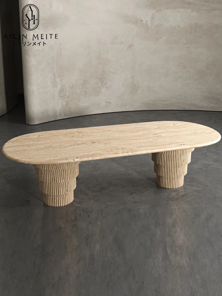 侘寂風を感じる天然洞石のダイニングテーブル - デザイナーズモデル、ホテルや別荘にぴったりの高級感あふれる楕円形のロングテーブル。優雅な食卓で特別なひとときを演出します。