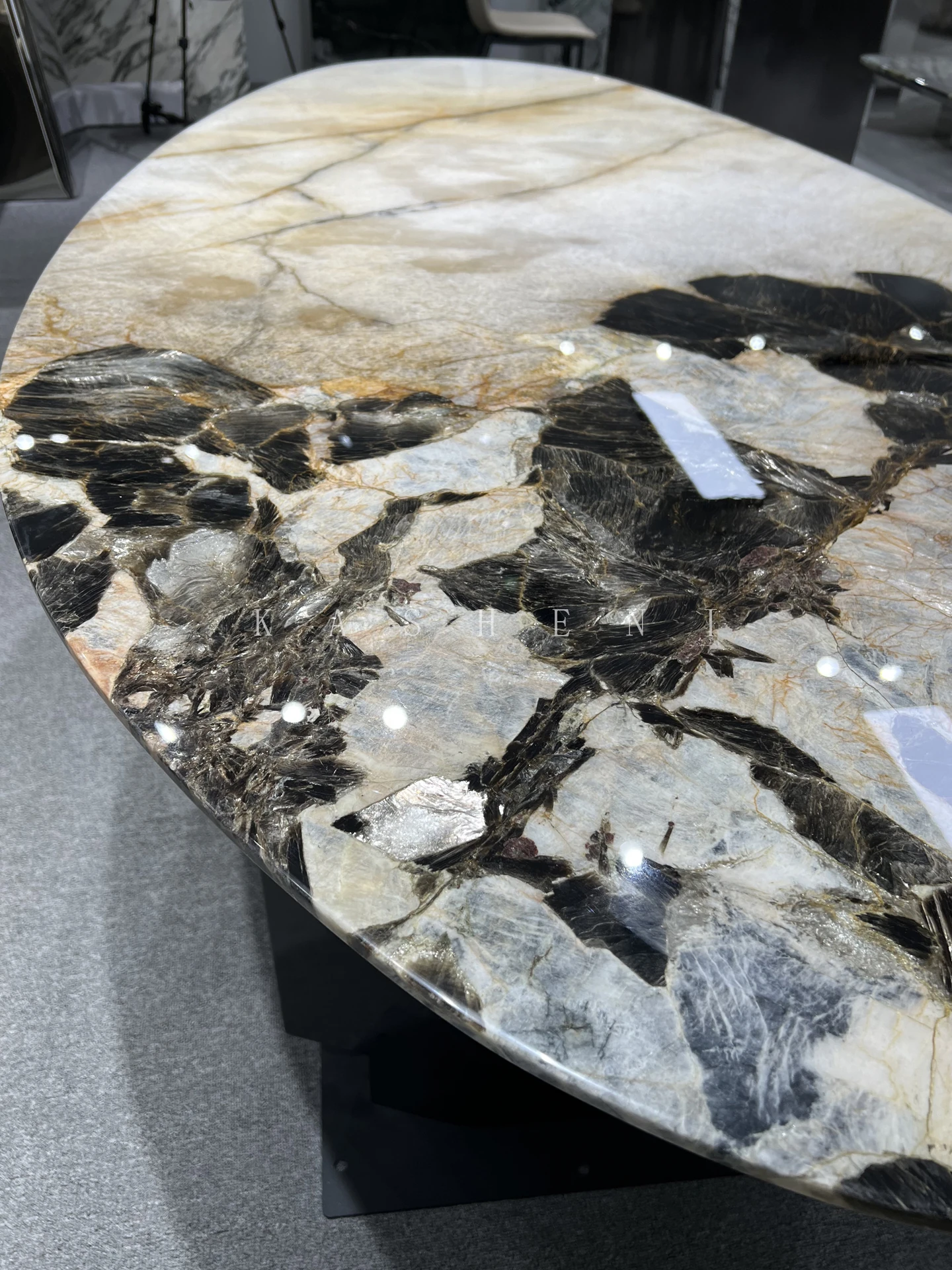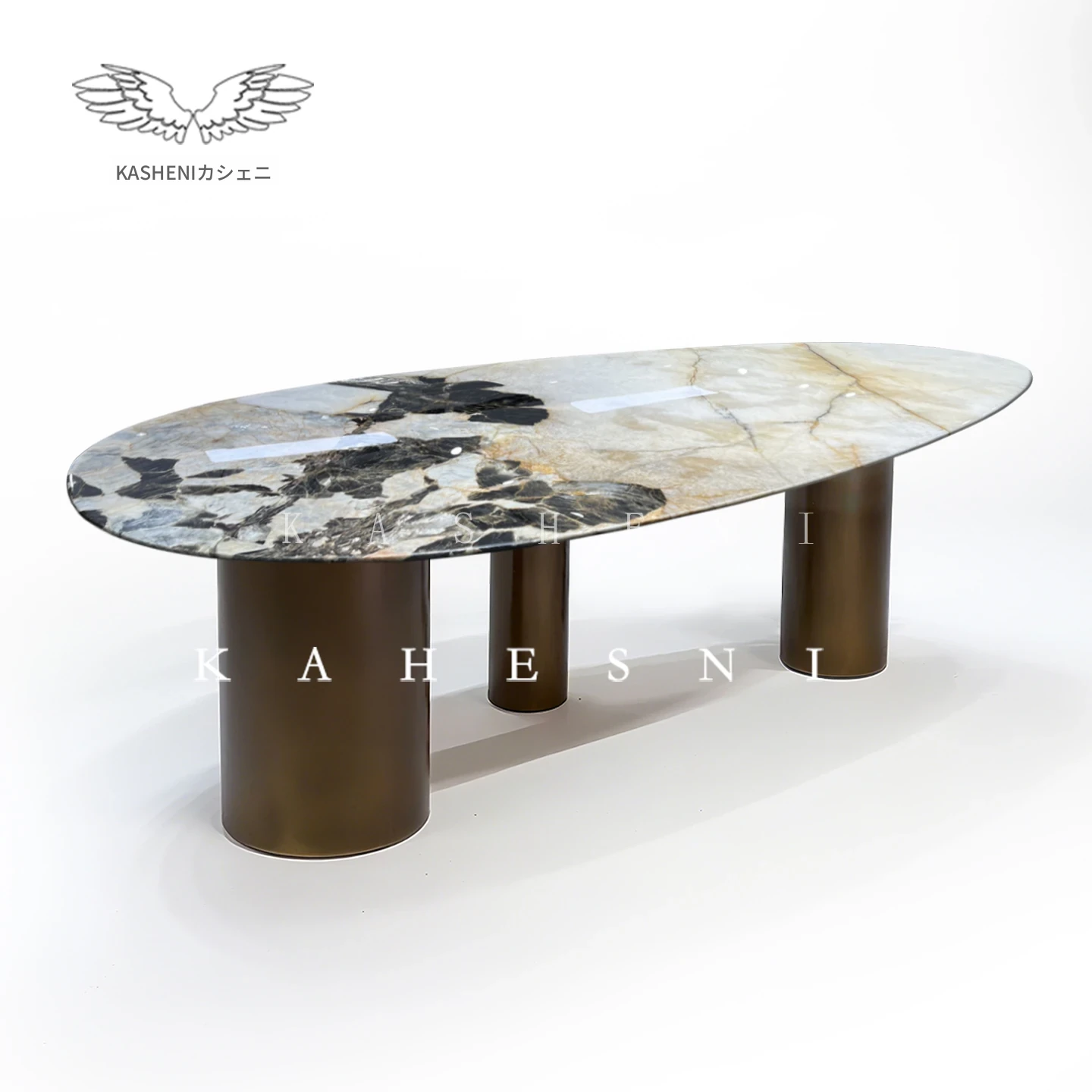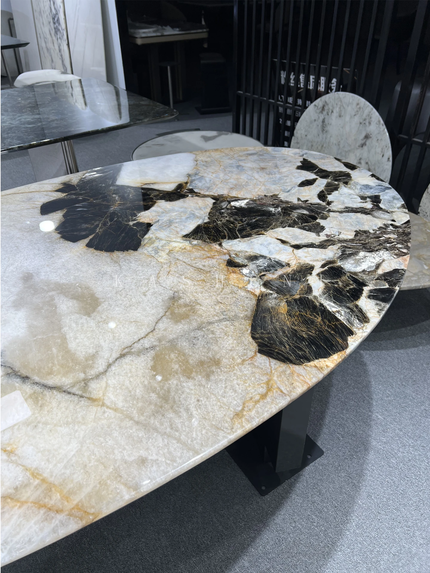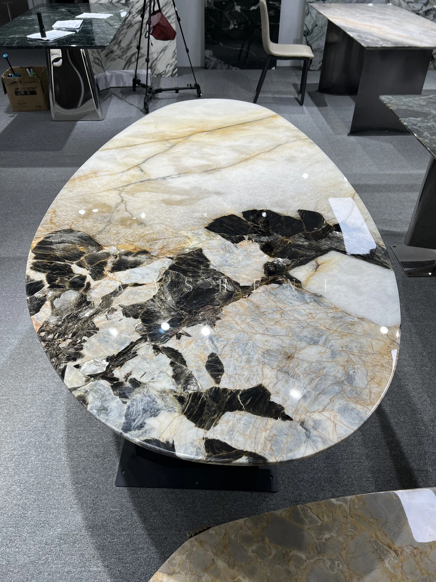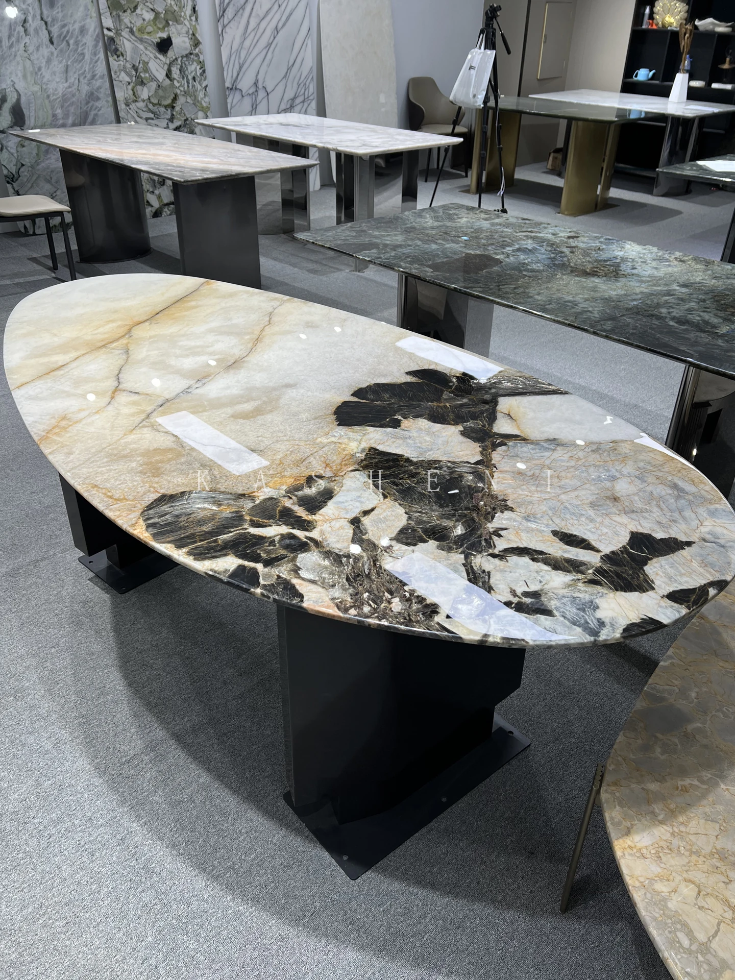 水滴型のブラックダイヤモンド・パンドラ・ラグジュアリー石材ダイニングテーブル - 高級ヴィラや豪華なフラットにぴったりのエレガントな楕円形BAXTERのダイニングテーブルで、特別なひとときを演出します。