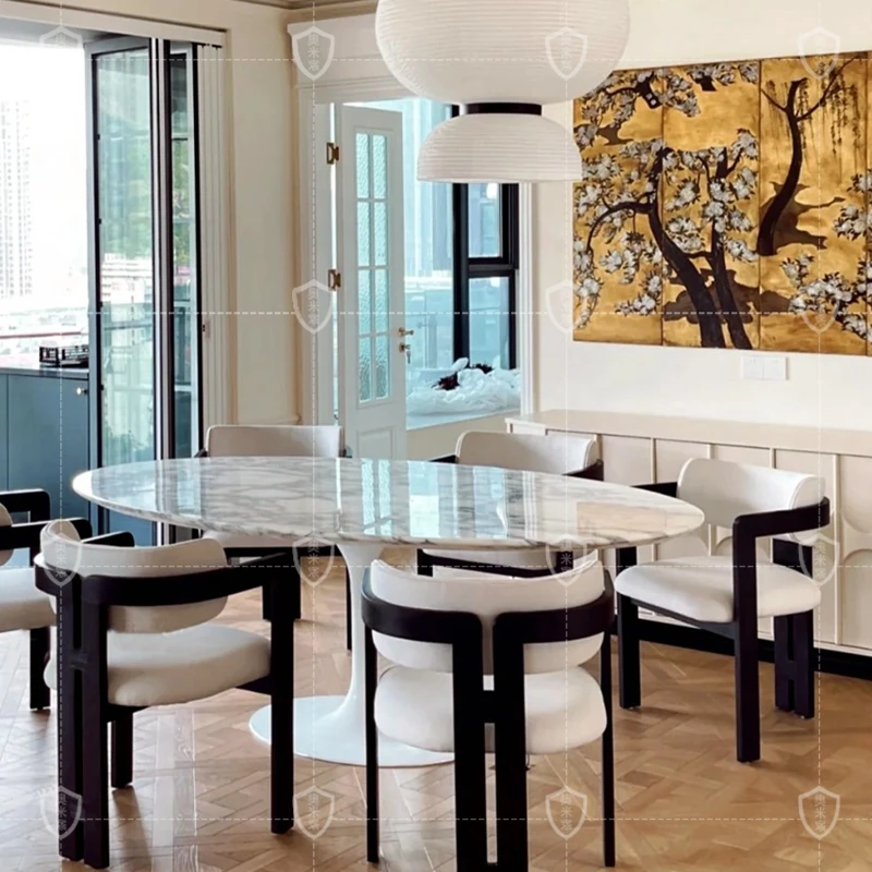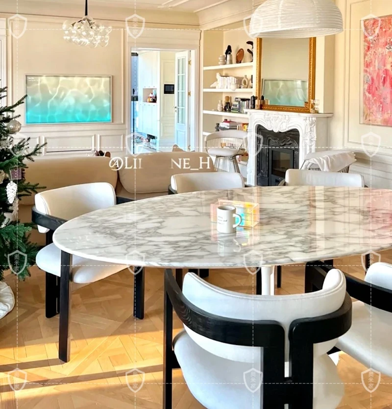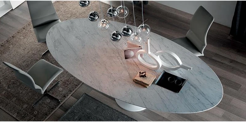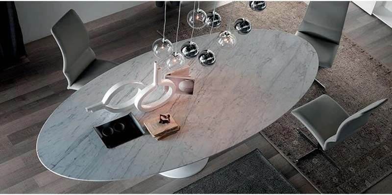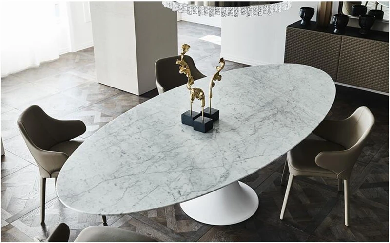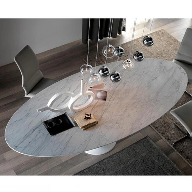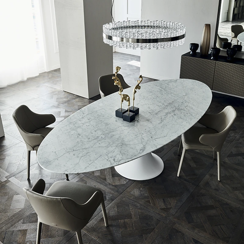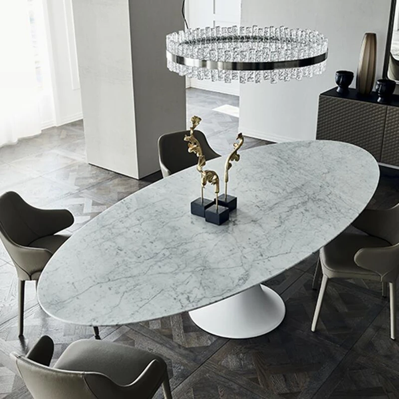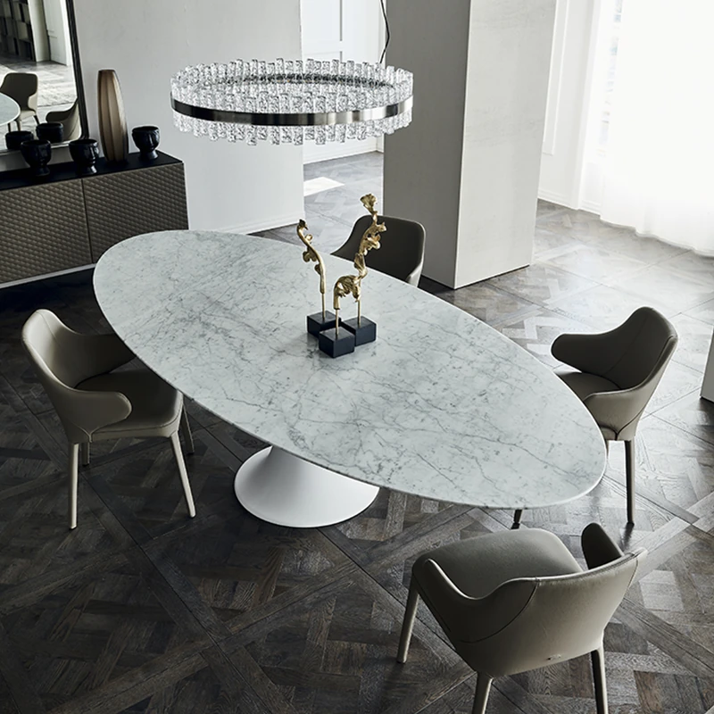 イタリアンデザインの天然大理石オーバルダイニングテーブル - モダンでラグジュアリーな雰囲気を演出する、上質なオーバルシェイプ。あなたの食卓を一層華やかに彩ります!