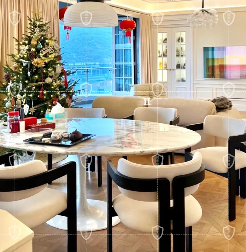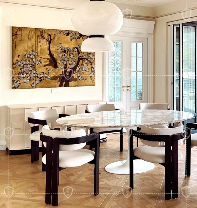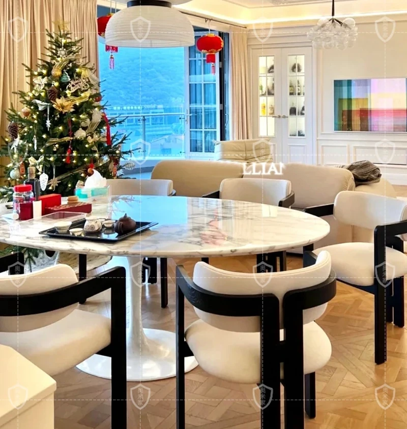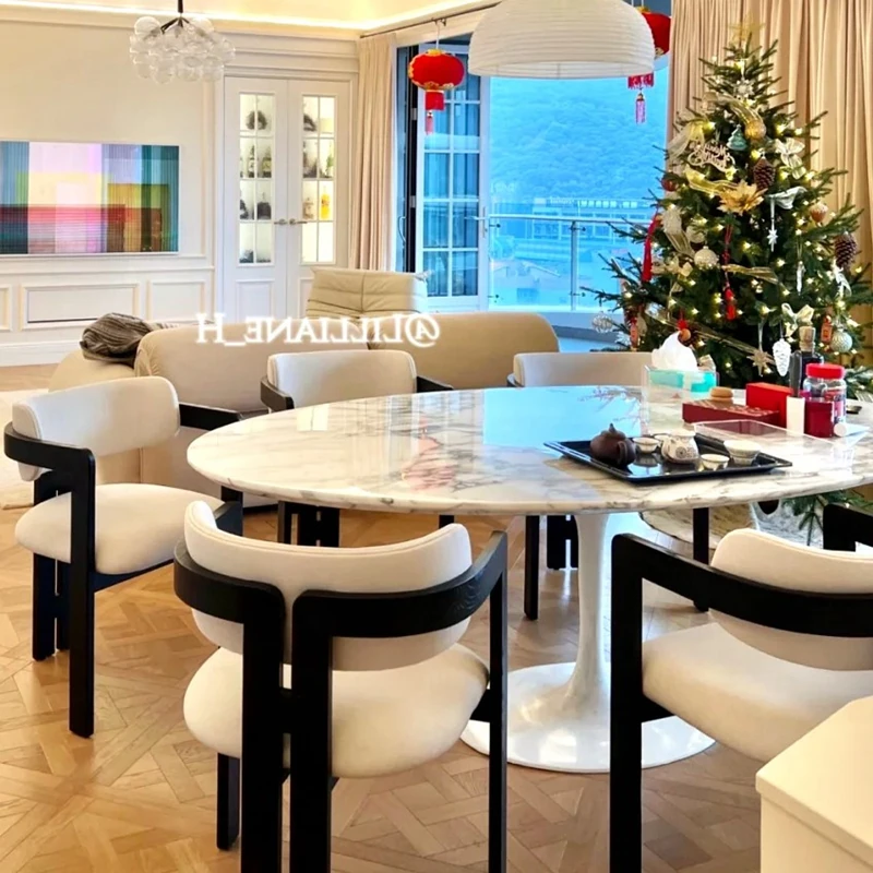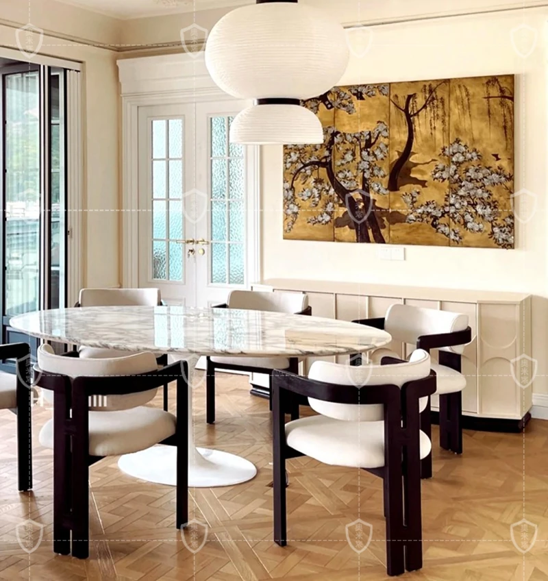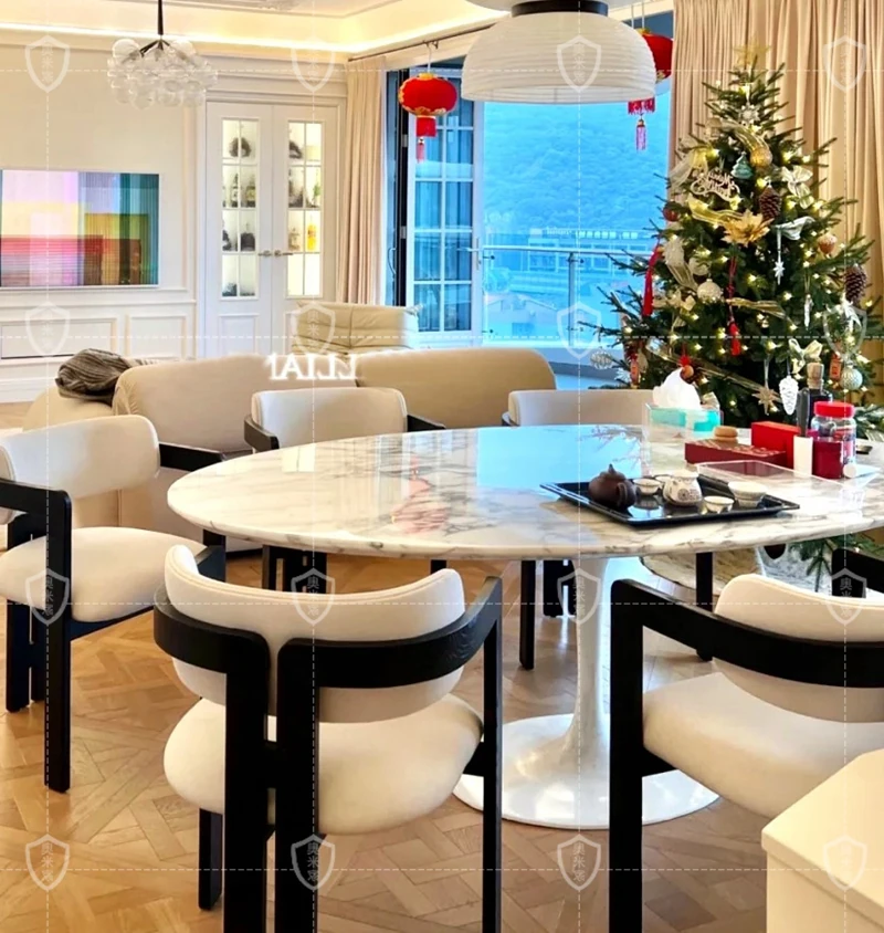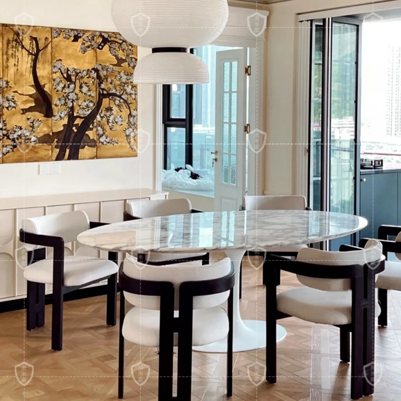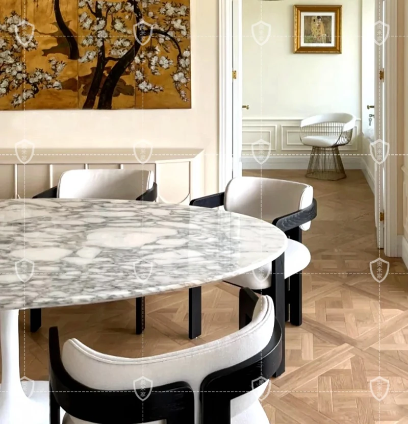 イタリアンデザインの天然大理石オーバルダイニングテーブル - モダンでラグジュアリーな雰囲気を演出する、上質なオーバルシェイプ。あなたの食卓を一層華やかに彩ります!