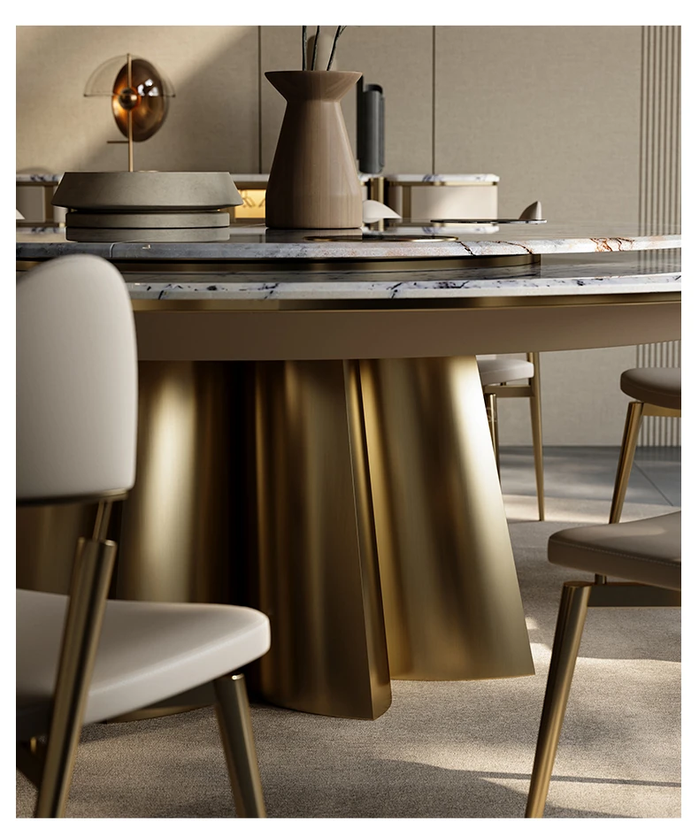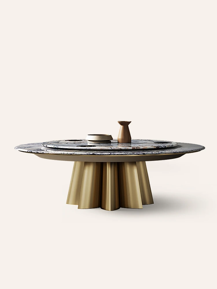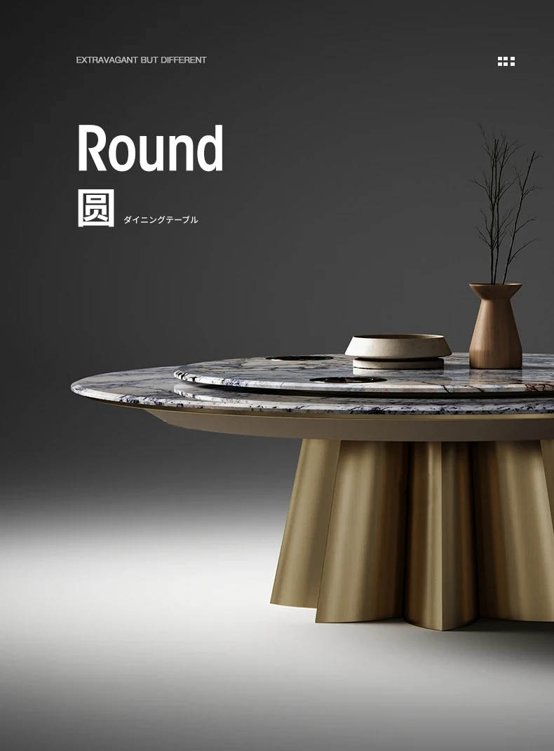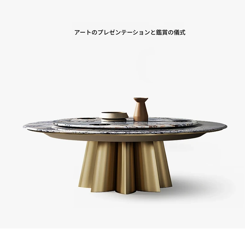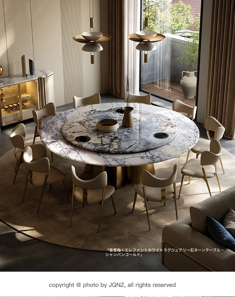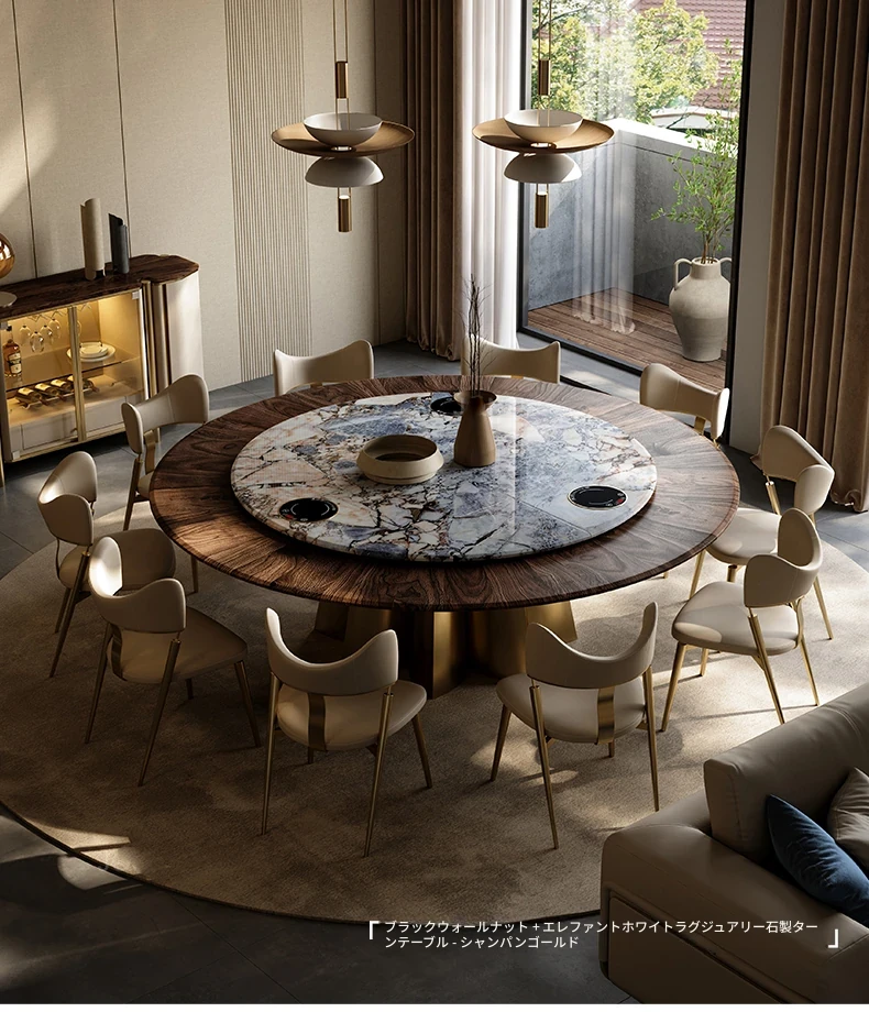 イタリアンラグジュアリー天然石ラウンドダイニングテーブル - 回転式電磁調理器付き、別荘にぴったりのスタイリッシュなテーブルセット!優雅なデザインで、食事のひとときを特別に演出します。