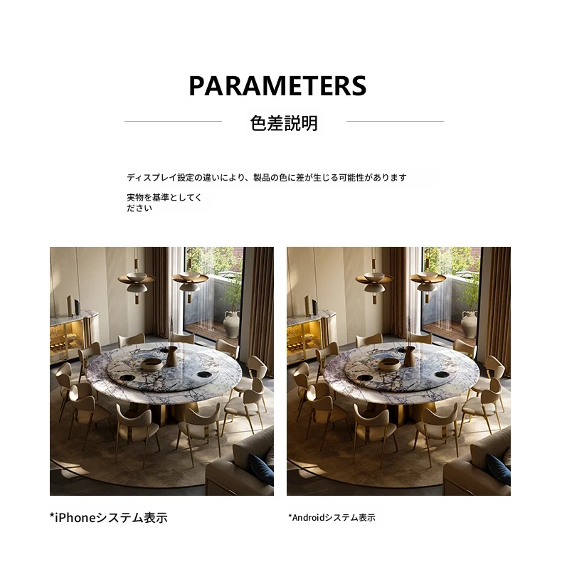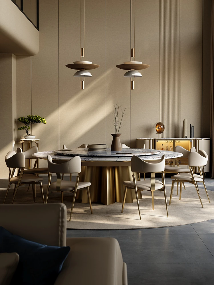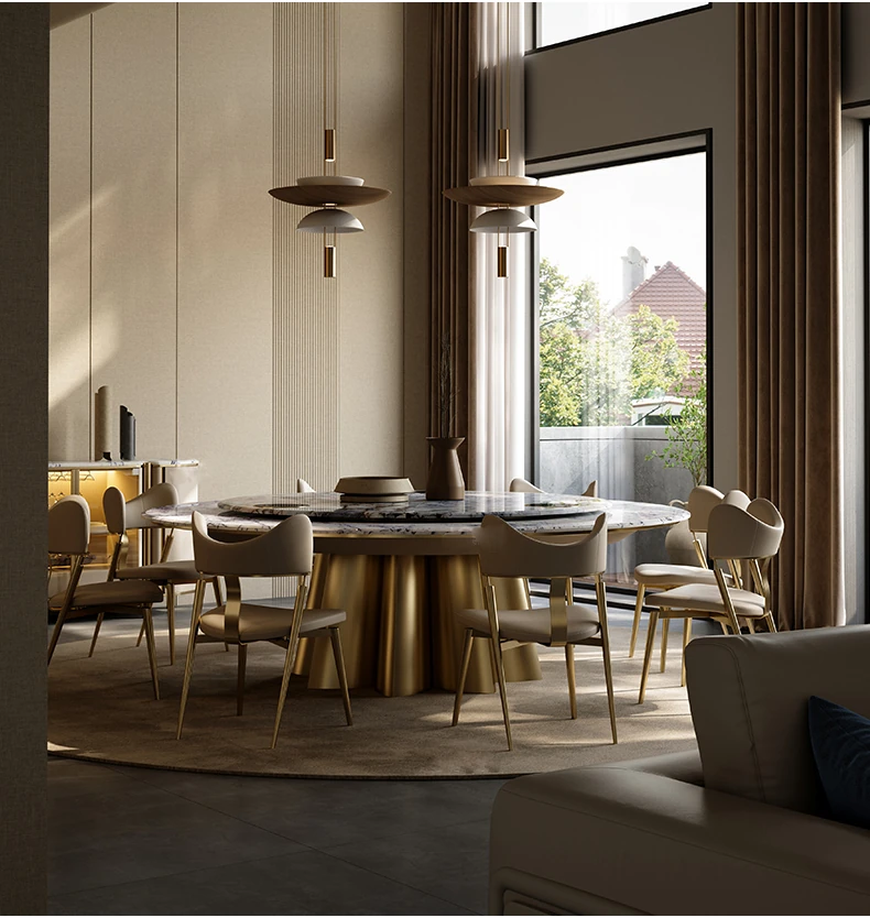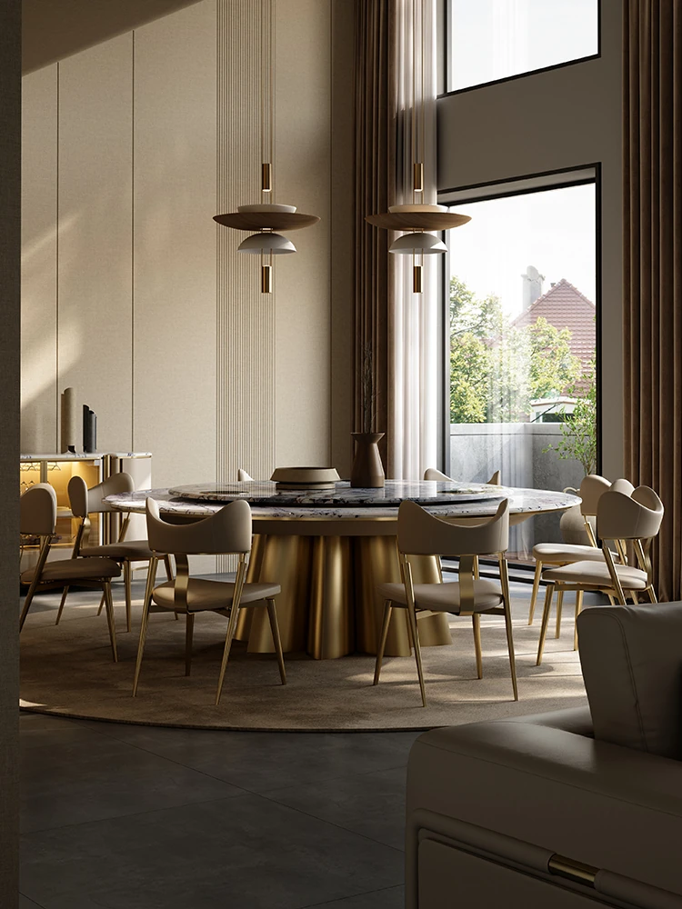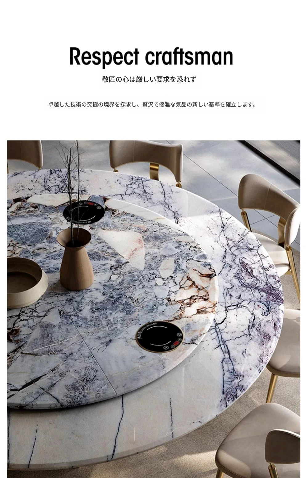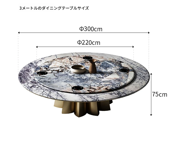 イタリアンラグジュアリー天然石ラウンドダイニングテーブル - 回転式電磁調理器付き、別荘にぴったりのスタイリッシュなテーブルセット!優雅なデザインで、食事のひとときを特別に演出します。