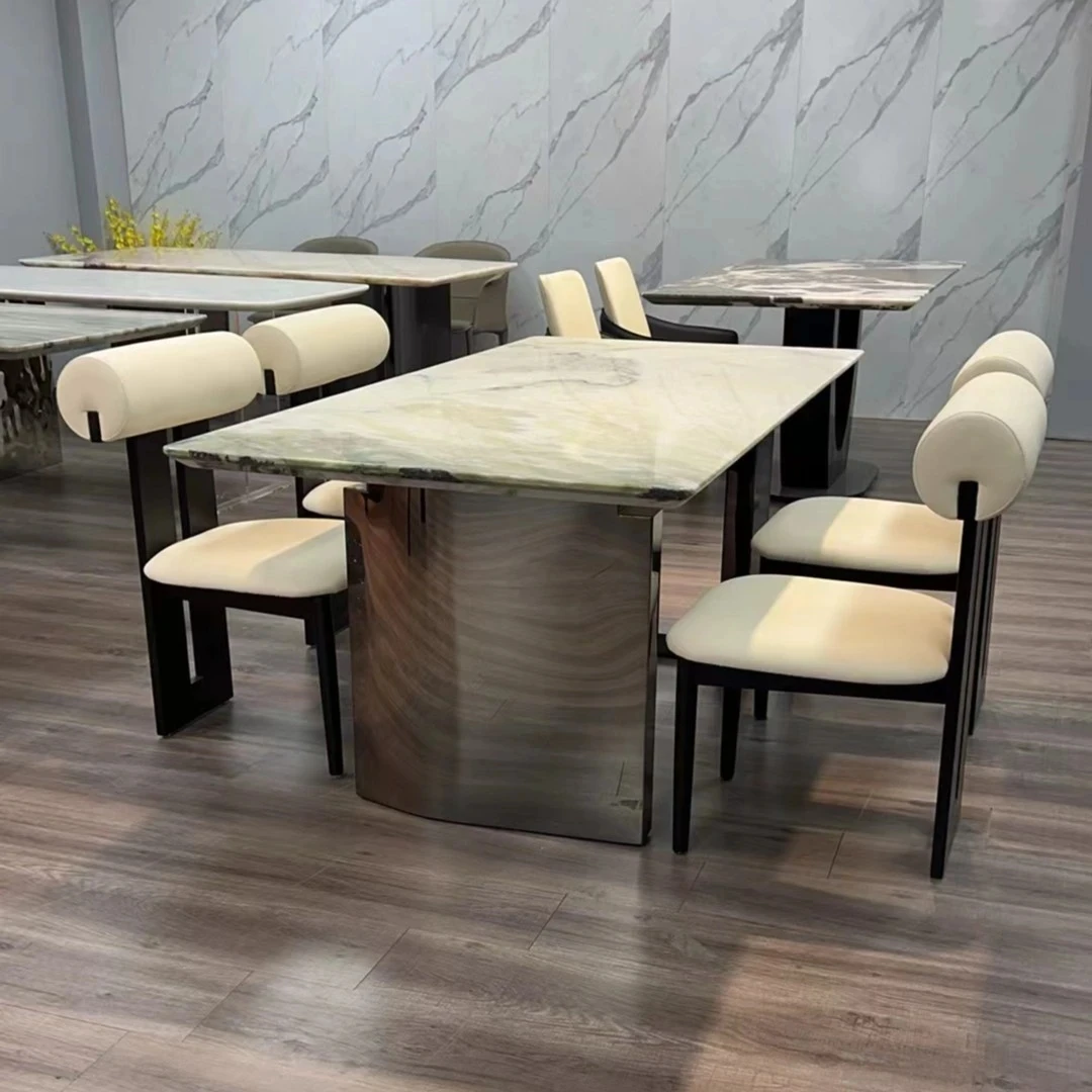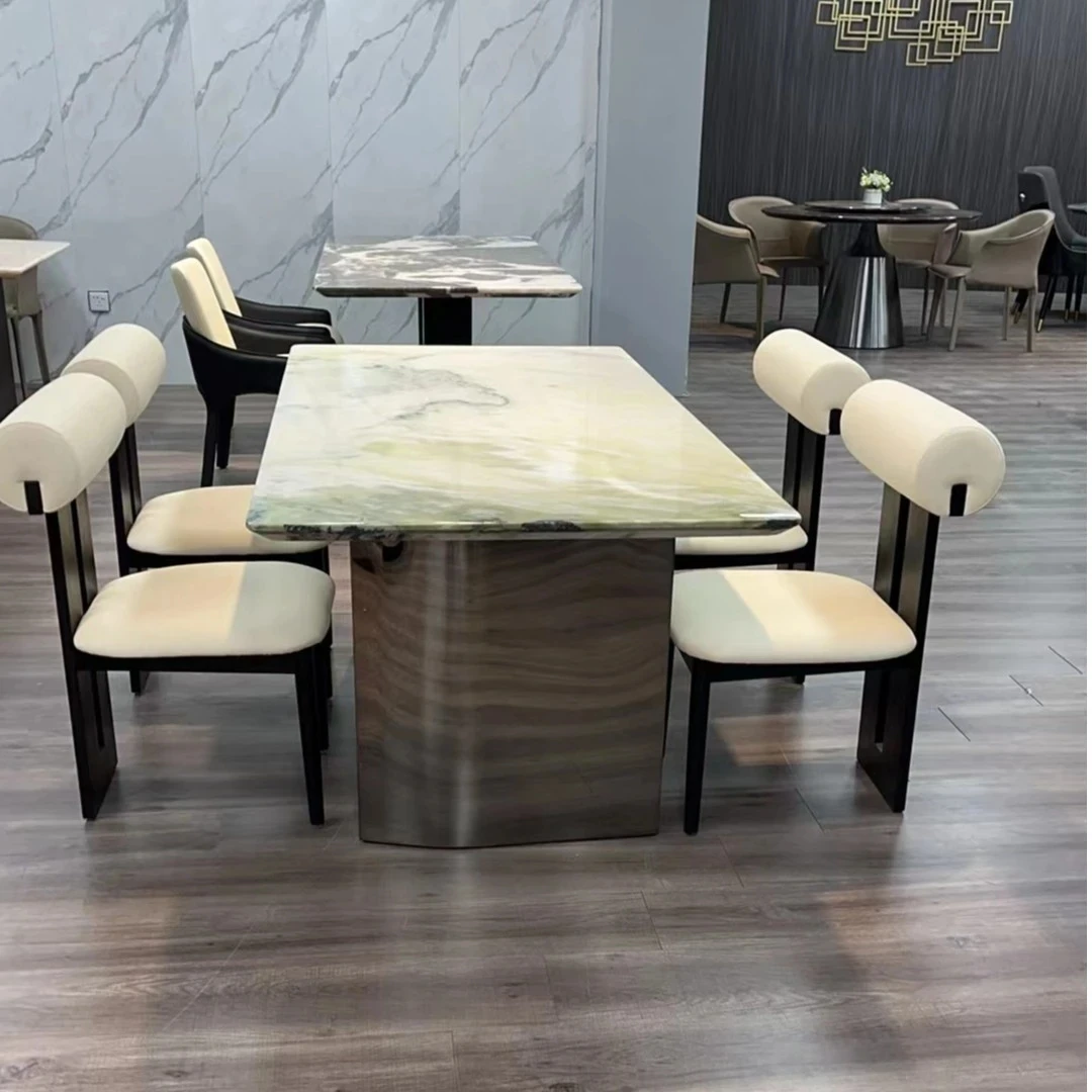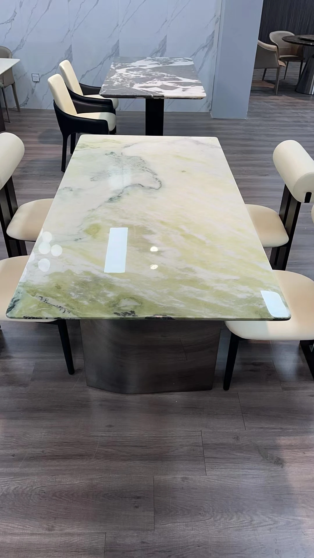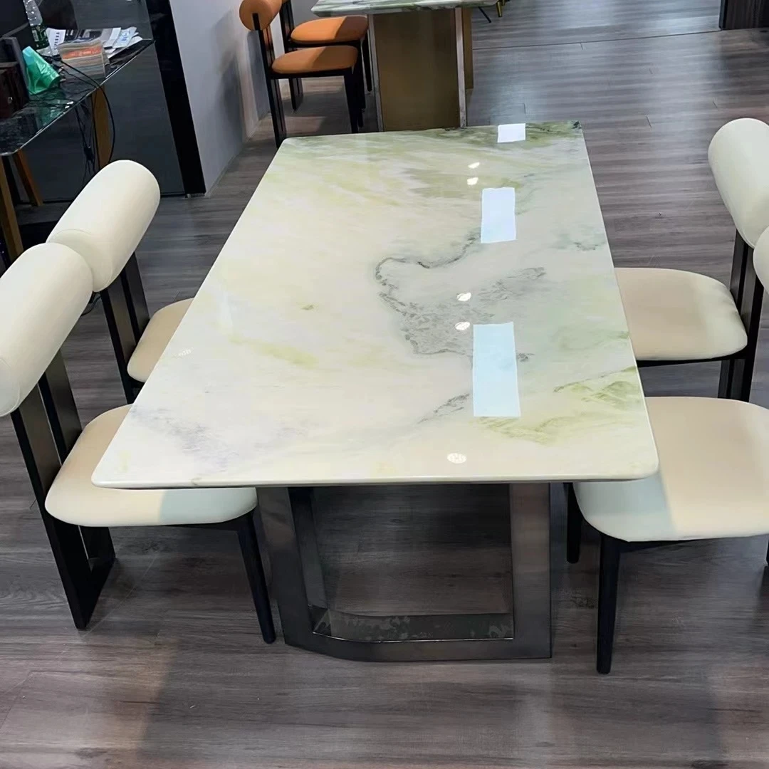 イタリアンミニマリズムの純天然フィンディグリーンラグジュアリー石の長方形ダイニングテーブル。シンプルで洗練された大理石デザインが、あなたの家にエレガントなスタイルをプラスします。軽やかな高級感をお楽しみください。