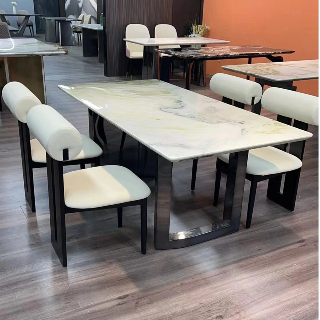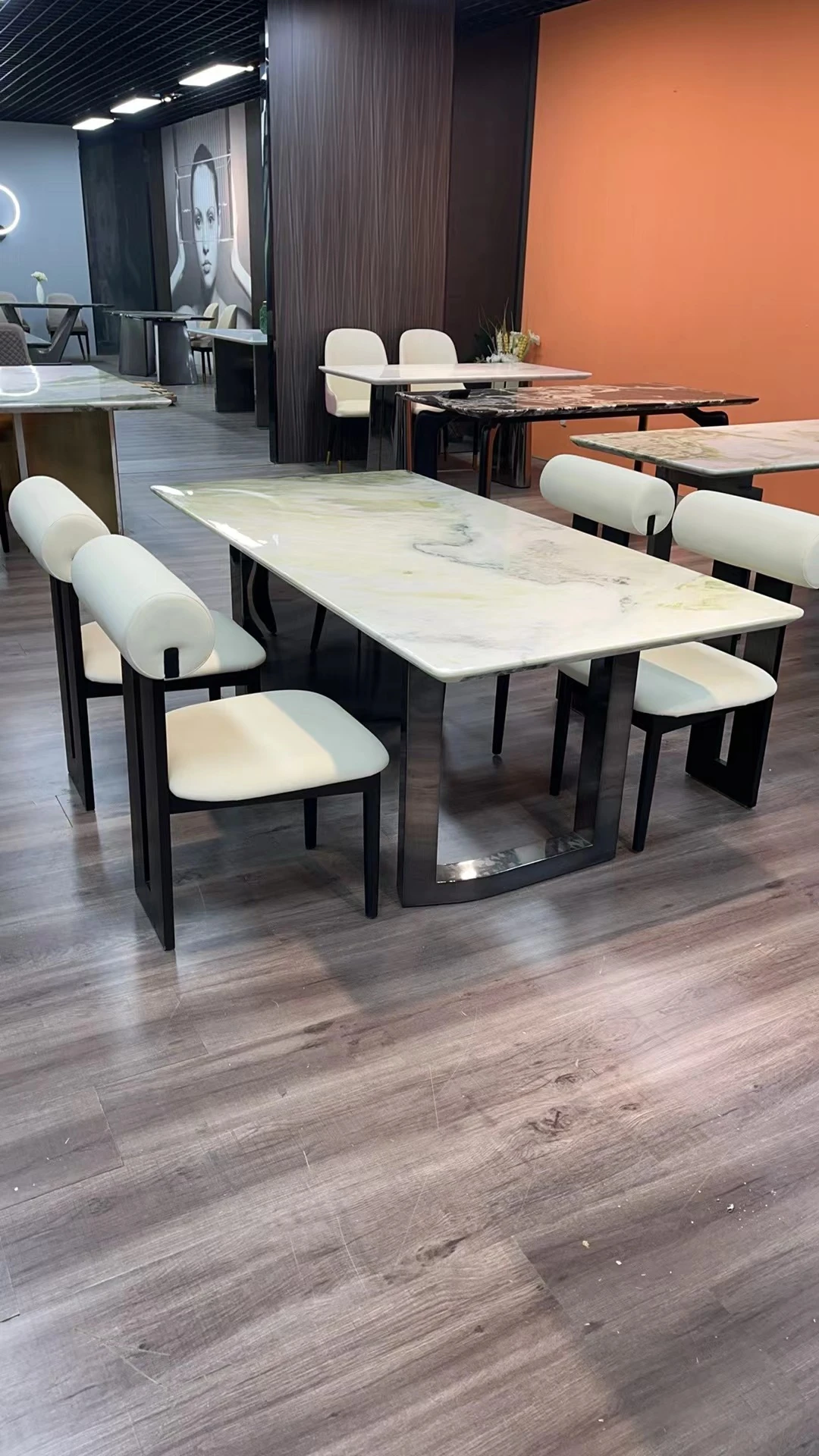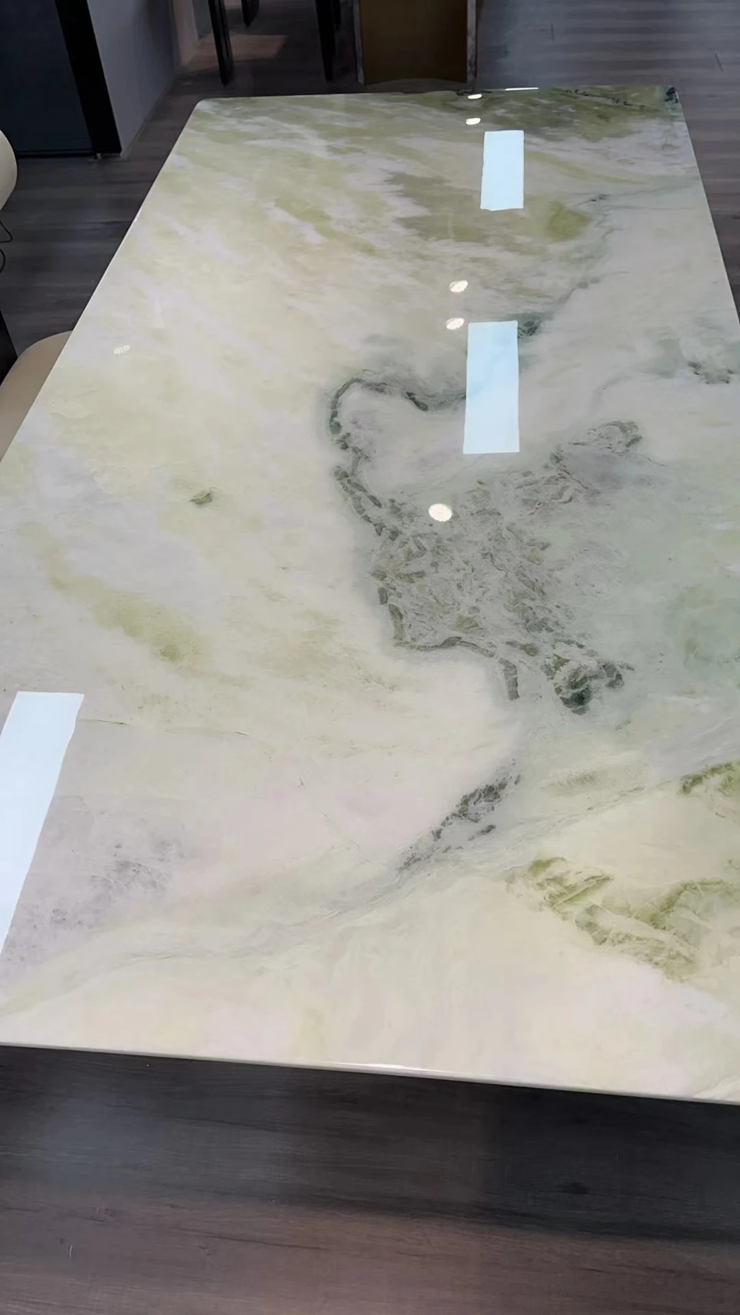 イタリアンミニマリズムの純天然フィンディグリーンラグジュアリー石の長方形ダイニングテーブル。シンプルで洗練された大理石デザインが、あなたの家にエレガントなスタイルをプラスします。軽やかな高級感をお楽しみください。