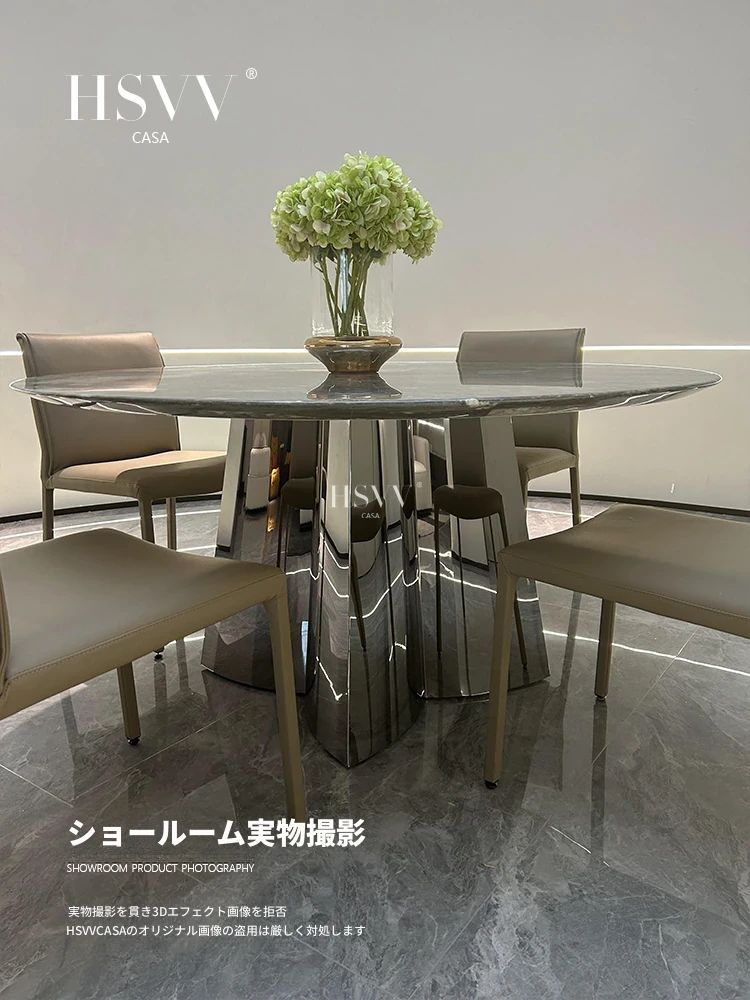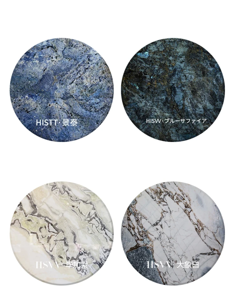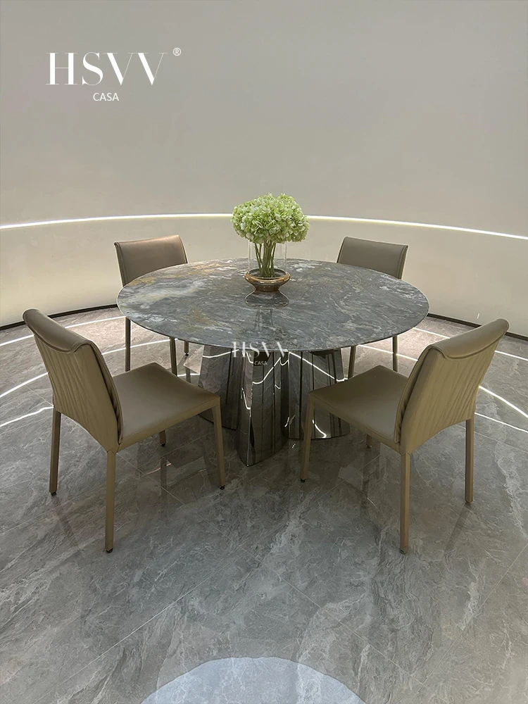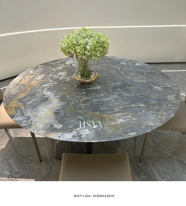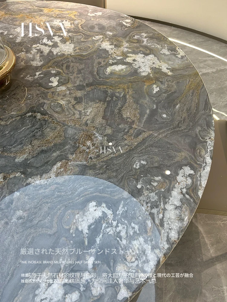 天然ブルーサンド円形ダイニングテーブル - 高級デザイン、ラグジュアリーな石材使用、洗練された大平层別荘にぴったりなテーブル&チェアセット、ミニマルな美しさを追求。