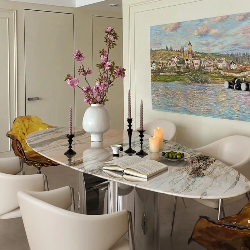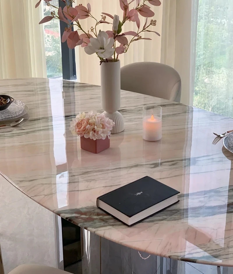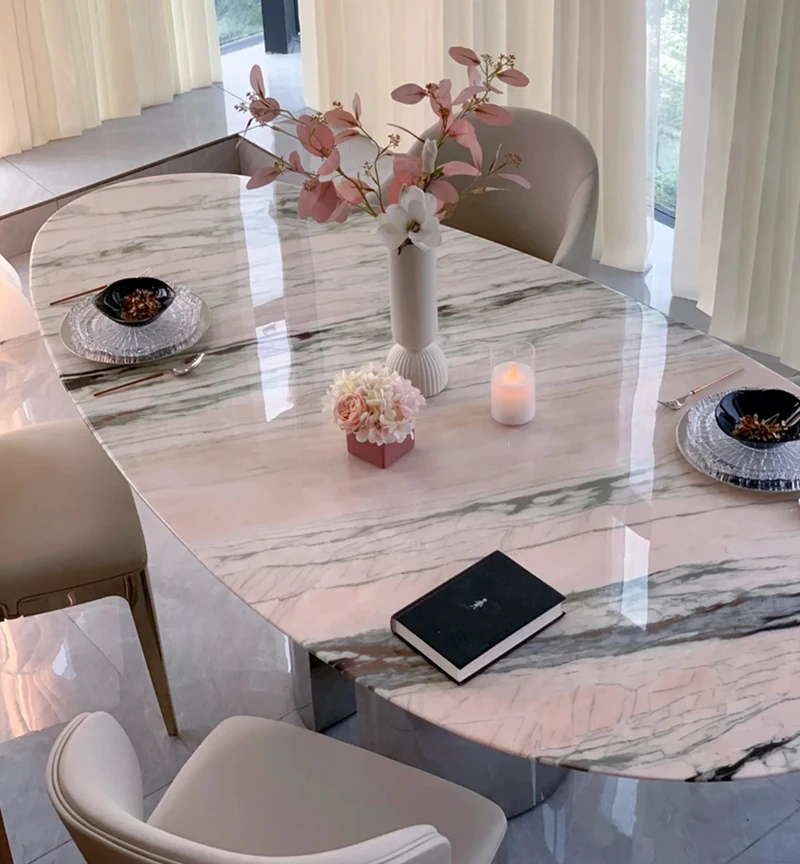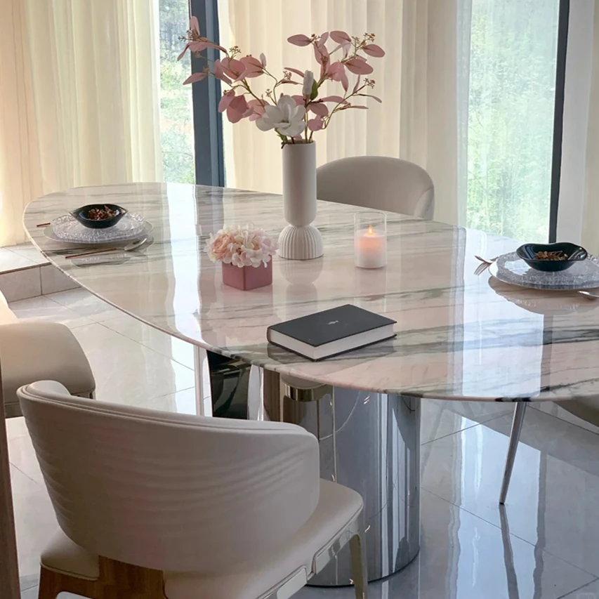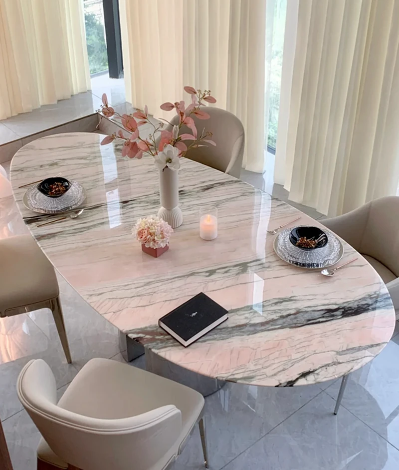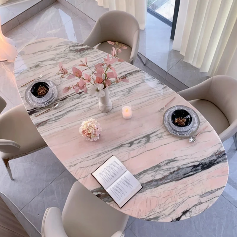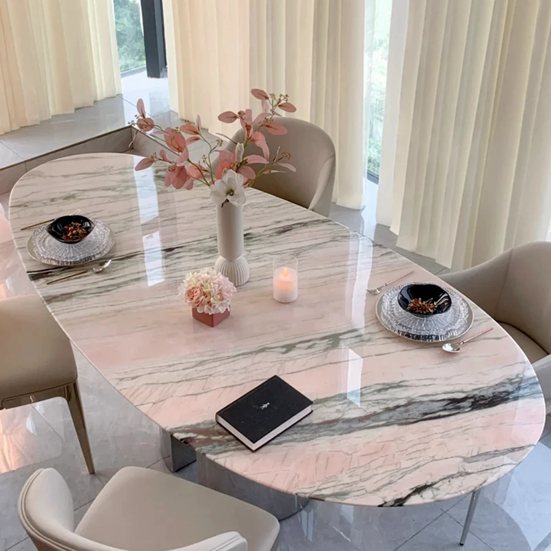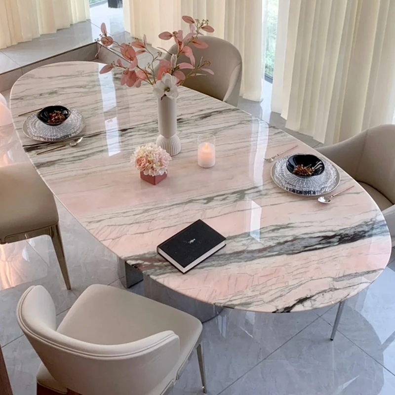 天然ラグジュアリーな水滴型大理石ピンクダイニングテーブル - イタリアンスタイルの軽奢なパンドラ石別荘大サイズダイニングテーブルで、上質な食事体験をお楽しみください。