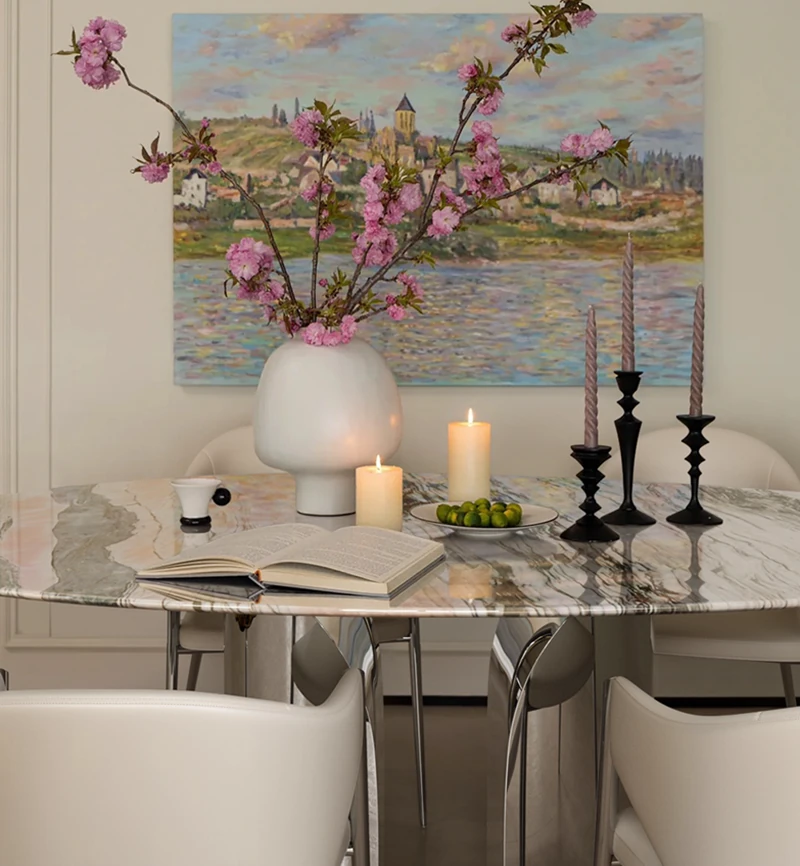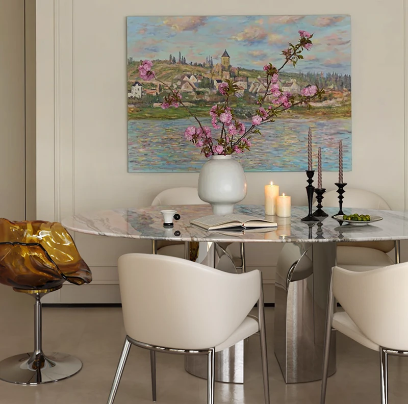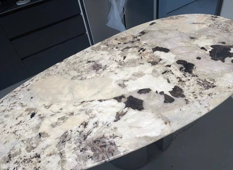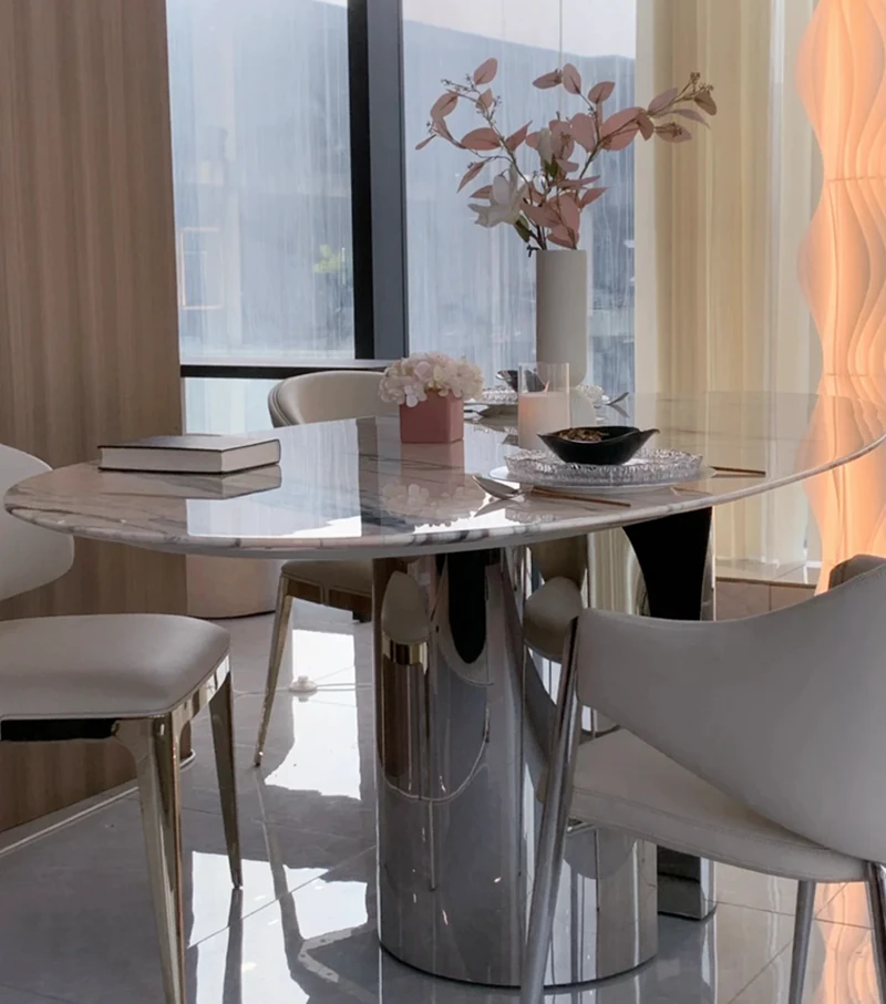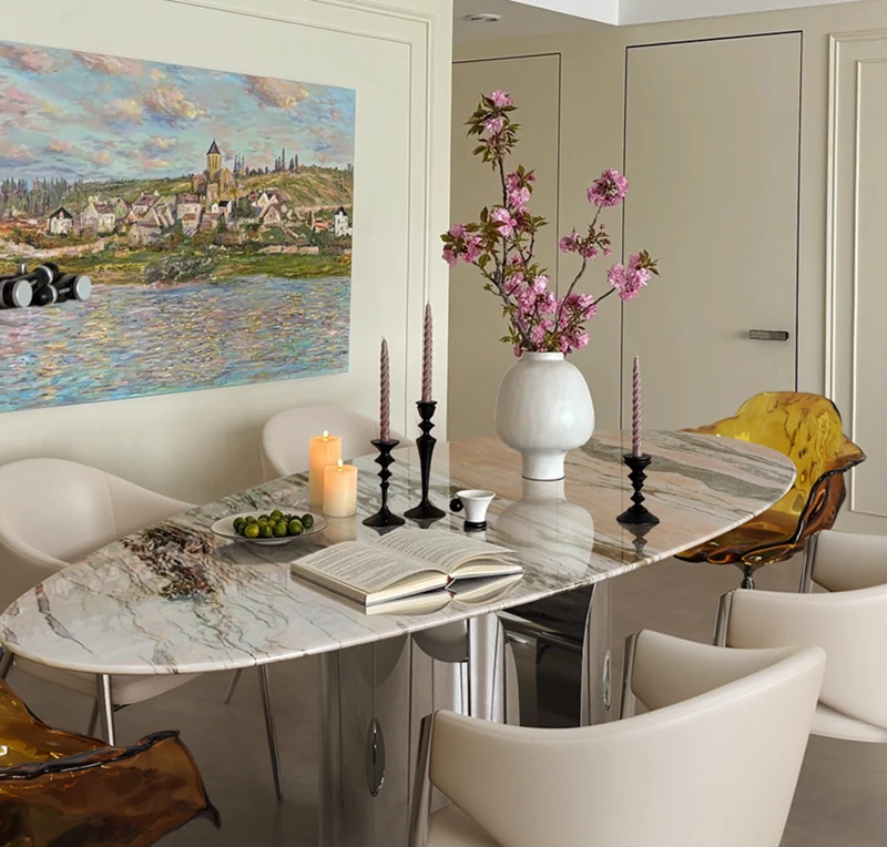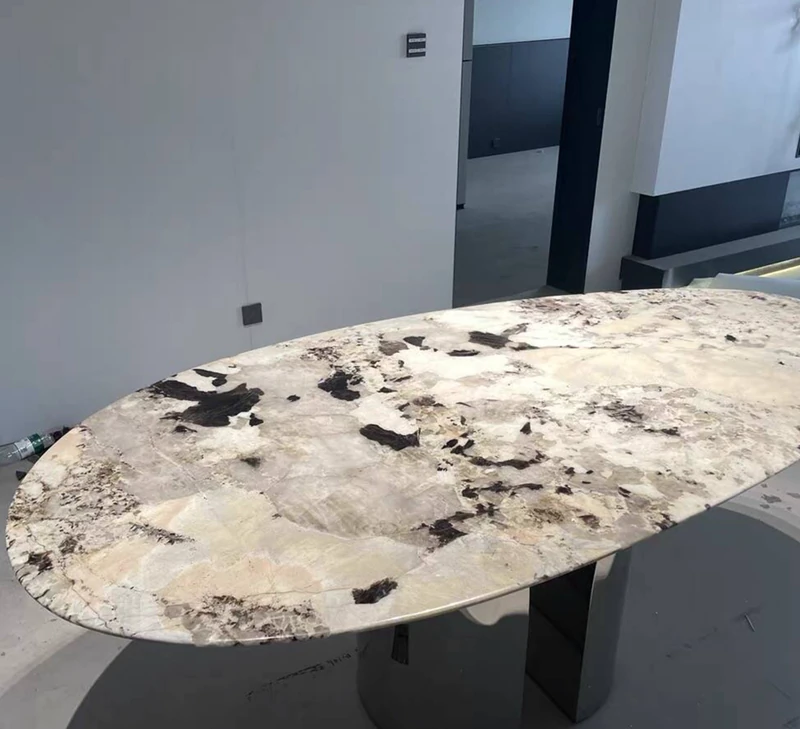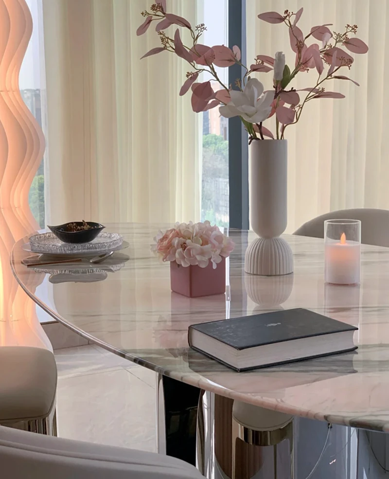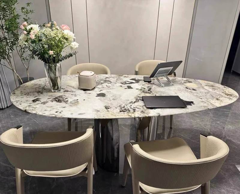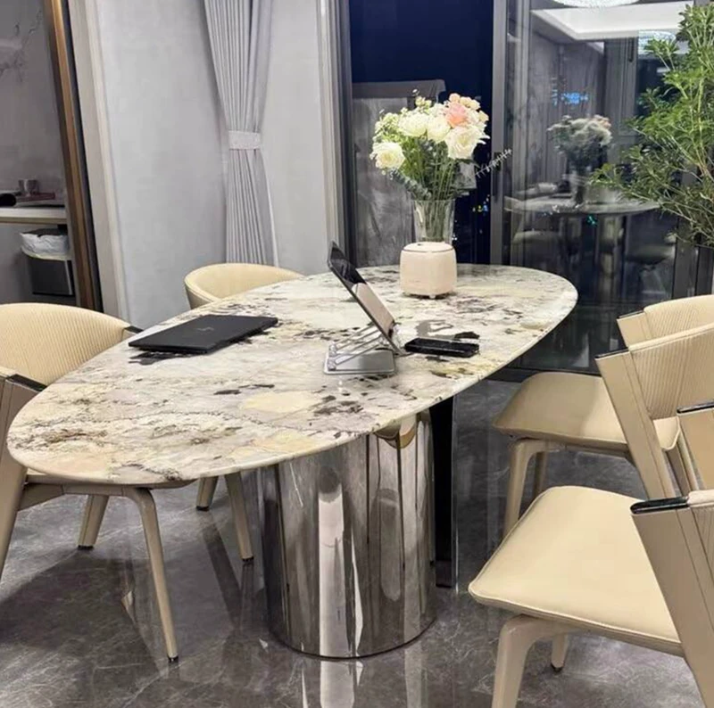 天然ラグジュアリーな水滴型大理石ピンクダイニングテーブル - イタリアンスタイルの軽奢なパンドラ石別荘大サイズダイニングテーブルで、上質な食事体験をお楽しみください。