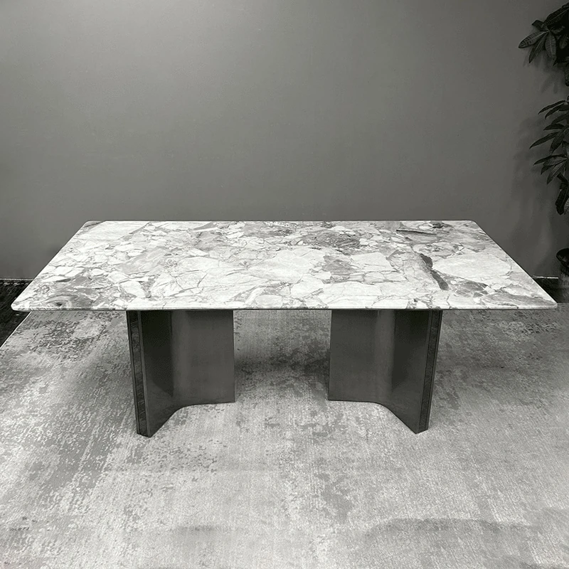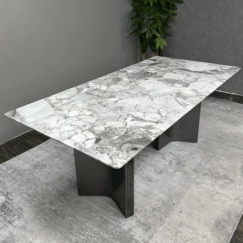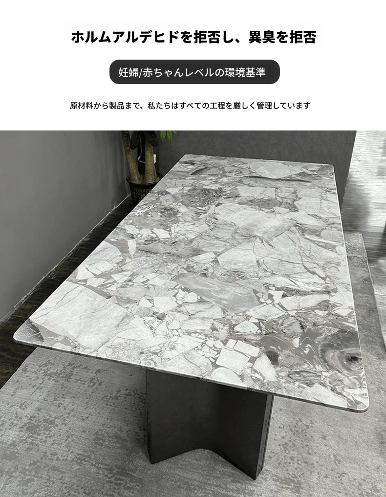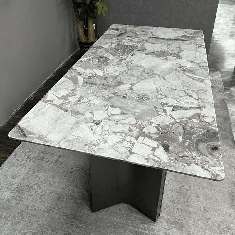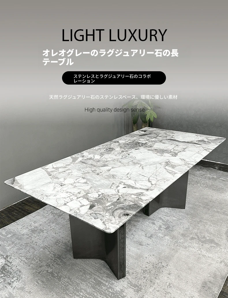 オレオグレー高級天然大理石ダイニングテーブル - ヴィラや豪邸にぴったりのエレガントな長方形デザイン。洗練された雰囲気で、食事のひとときを特別に演出します。テーブルと椅子のセットで、贅沢な空間をお楽しみください。