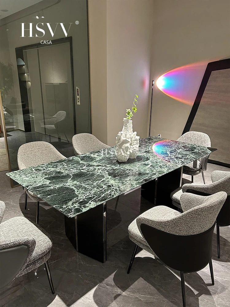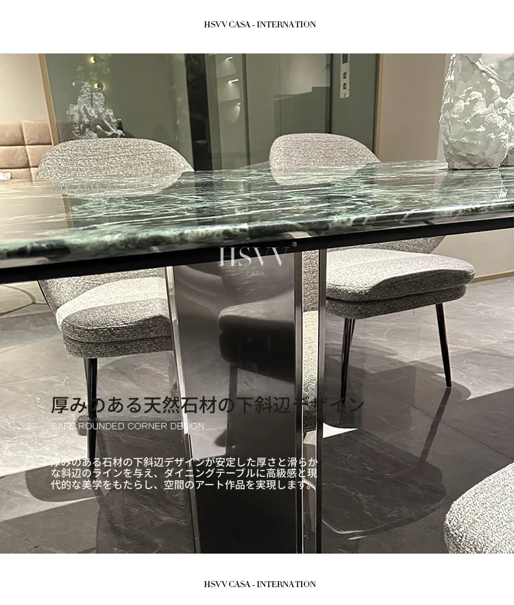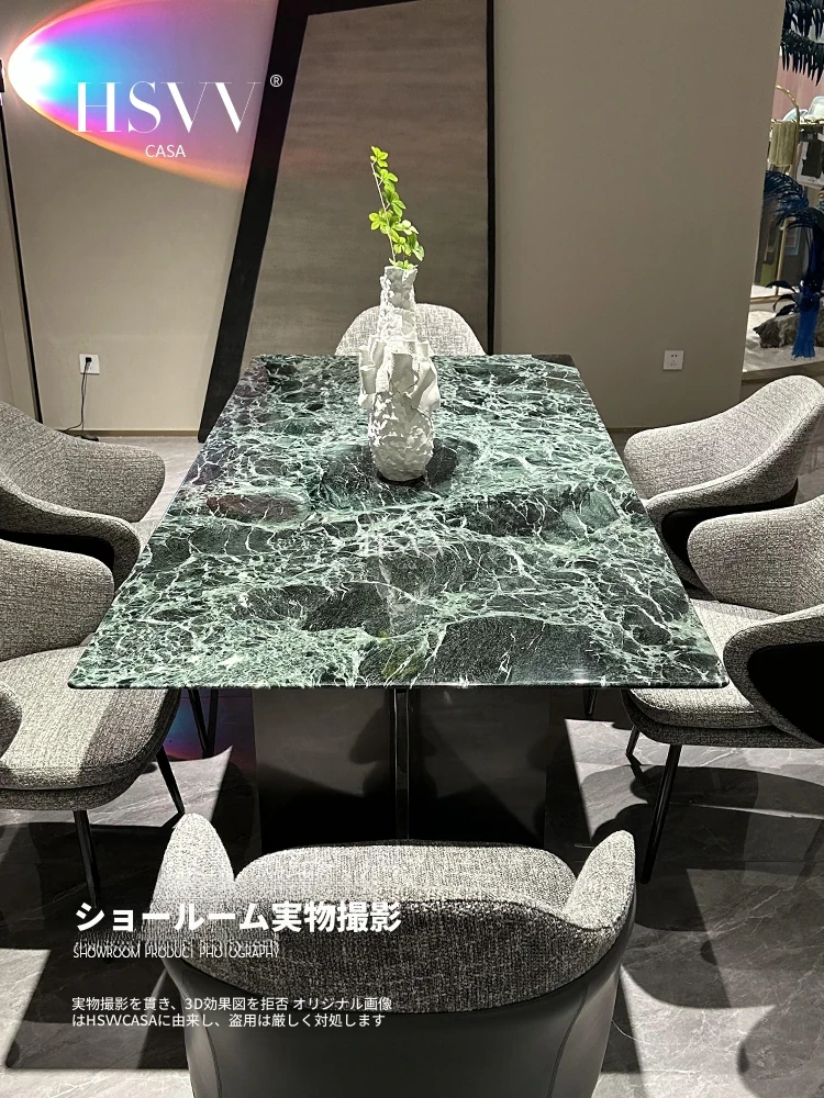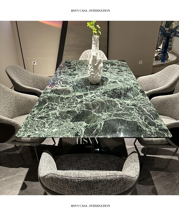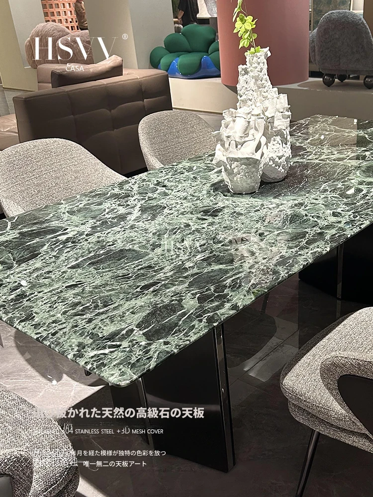 プラダグリーン天然石製ダイニングテーブル - デザイナーが手掛けた長方形の高級家用テーブル・椅子セット、洗練された大平層や別荘に最適!
