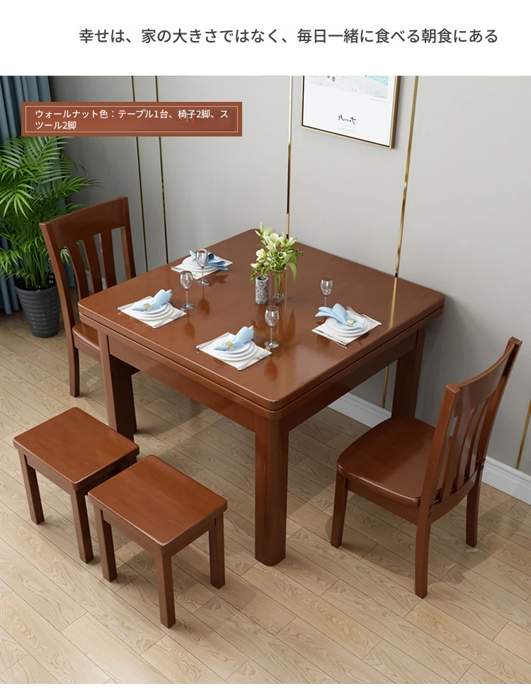 ウォールナット色の単テーブル+4椅子+2スツール、80x80x76cm