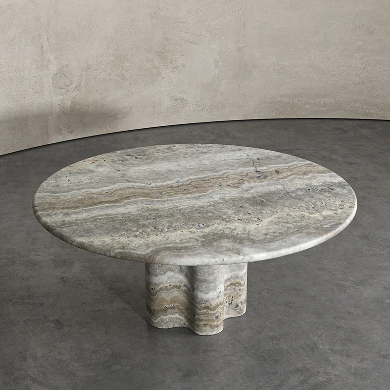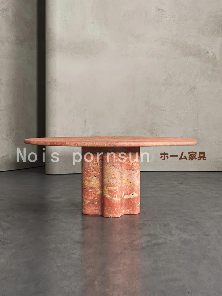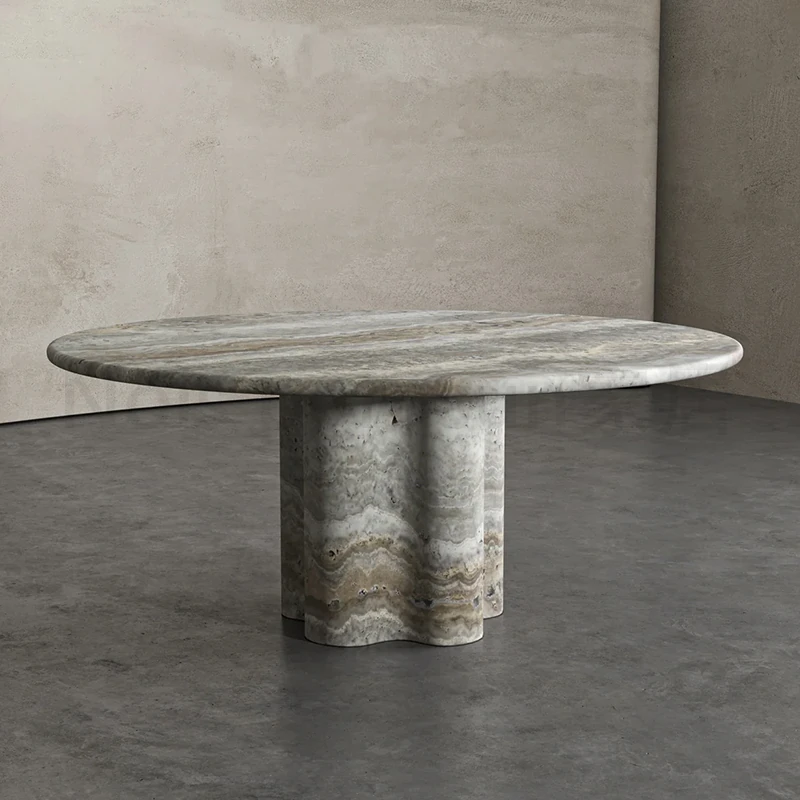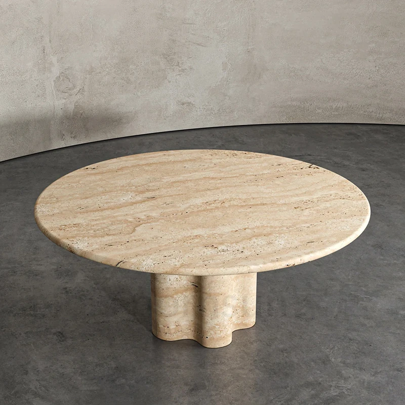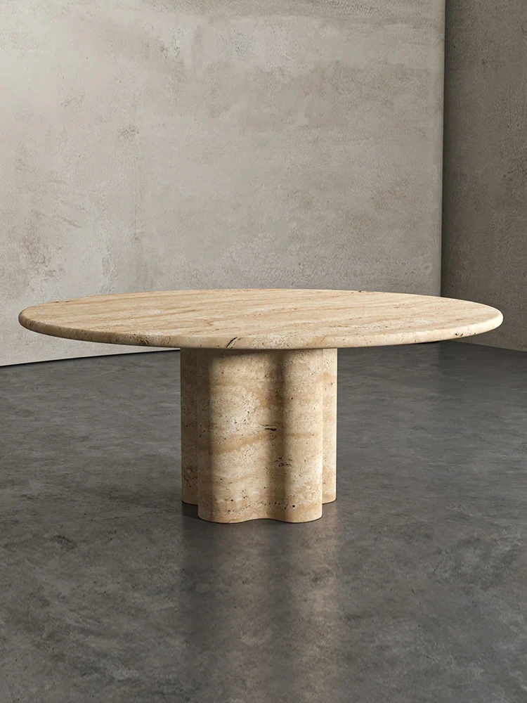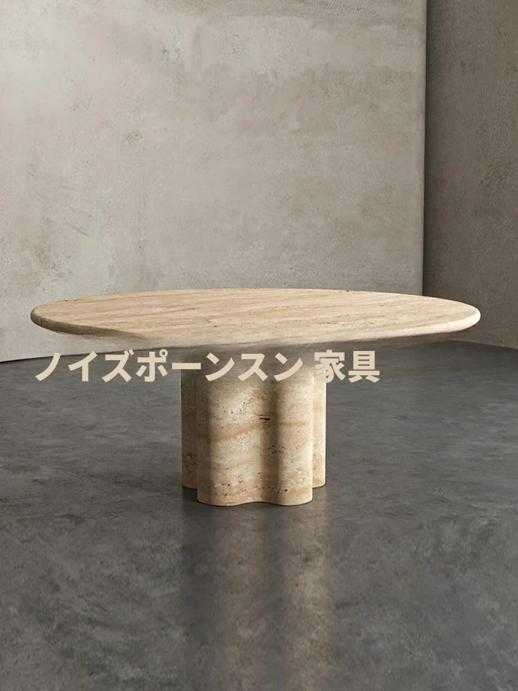侘寂風の天然洞石を使用したラウンドダイニングテーブル - 小型住宅に最適なフレンチスタイルの大理石デザイン家具。美しい自然の美しさを感じながら、特別な食卓を演出します。