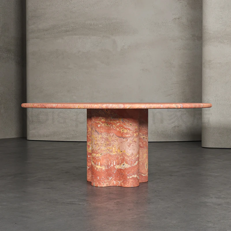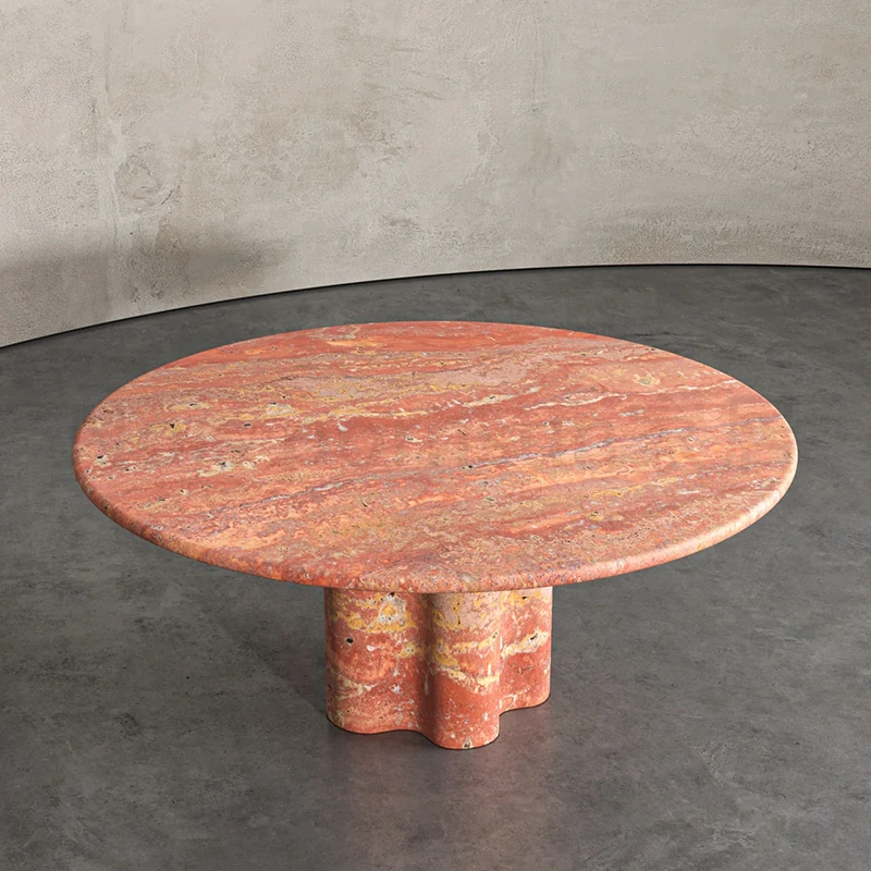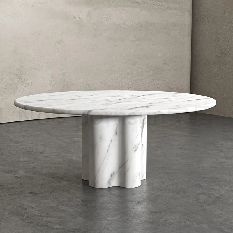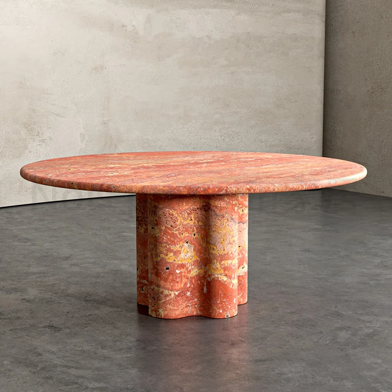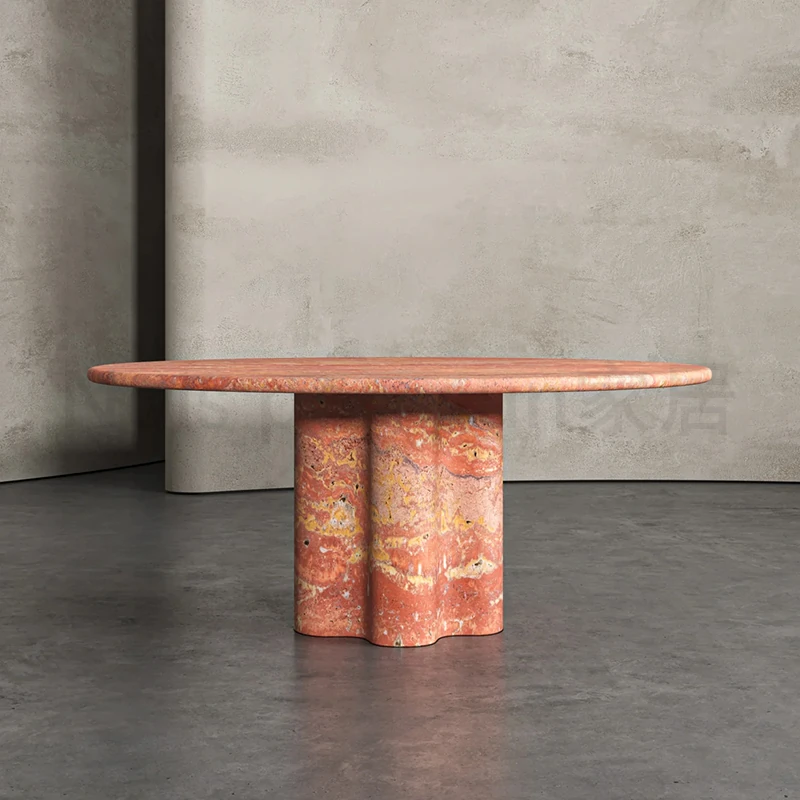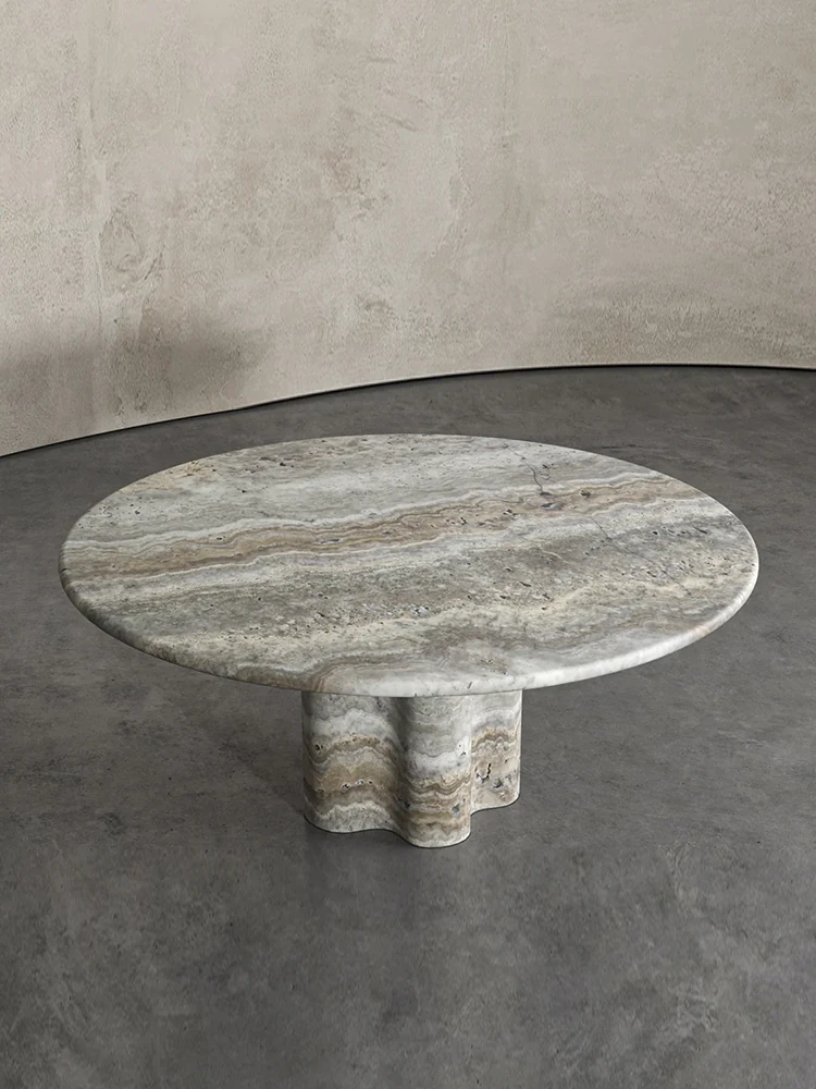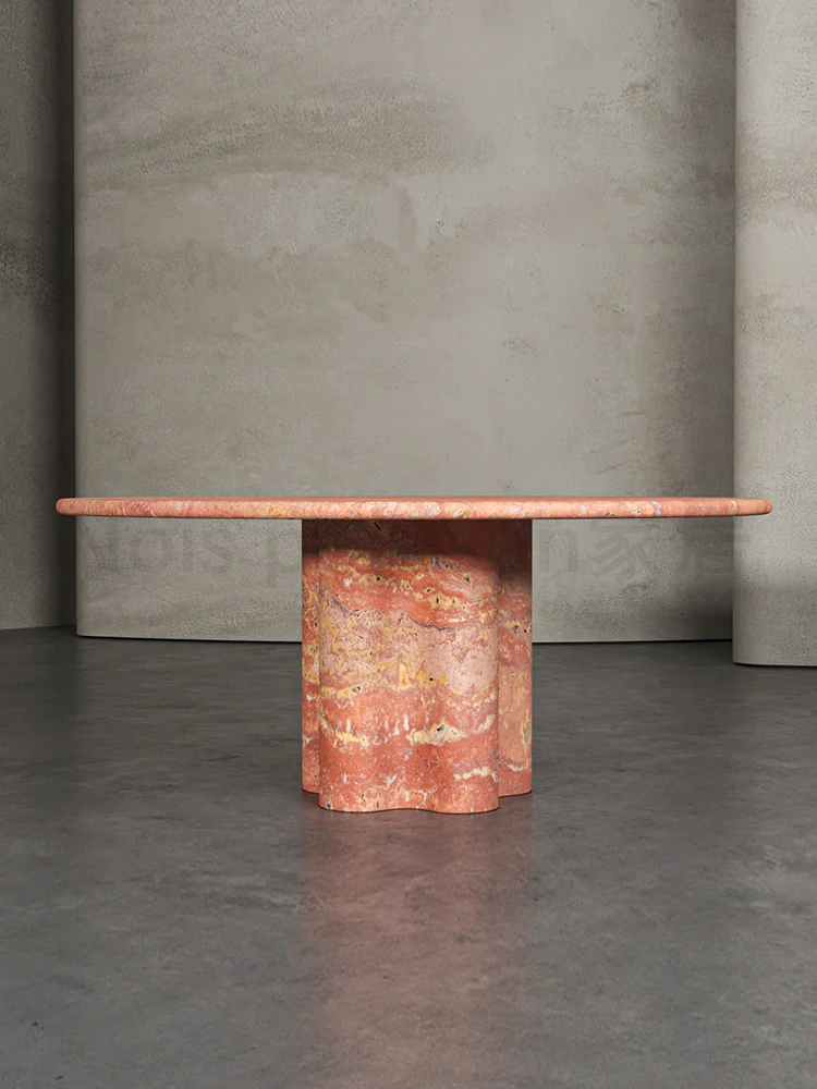 侘寂風の天然洞石を使用したラウンドダイニングテーブル - 小型住宅に最適なフレンチスタイルの大理石デザイン家具。美しい自然の美しさを感じながら、特別な食卓を演出します。