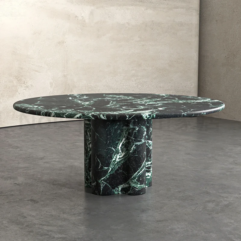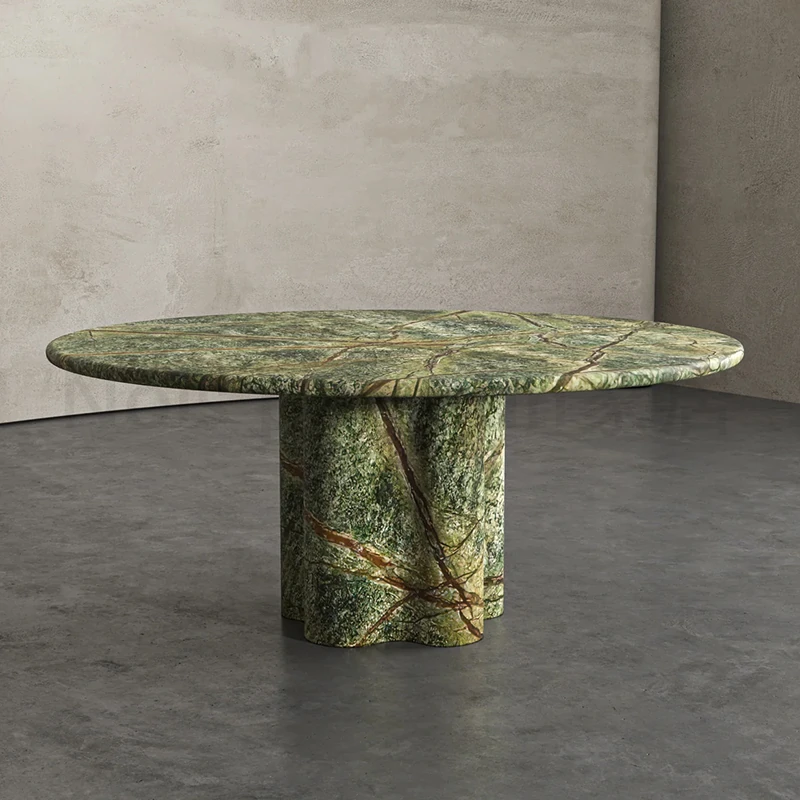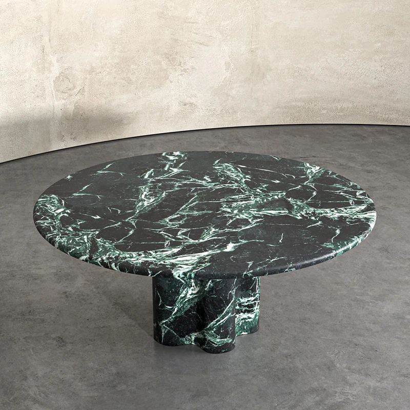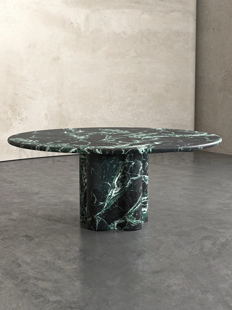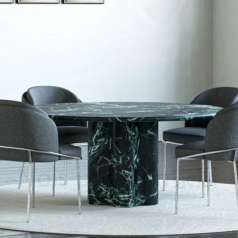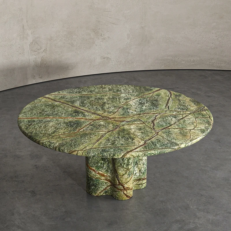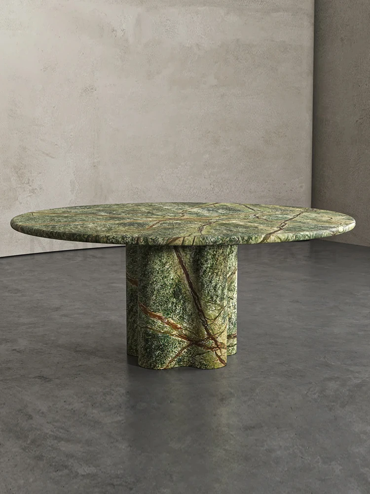 侘寂風の天然洞石を使用したラウンドダイニングテーブル - 小型住宅に最適なフレンチスタイルの大理石デザイン家具。美しい自然の美しさを感じながら、特別な食卓を演出します。