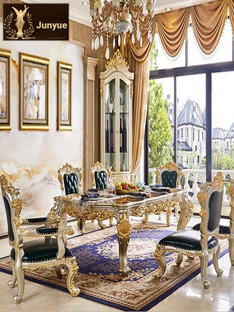 Luxurious European-Style 1.5m Round Solid Wood Dining Table with Exquisite Marble Top and Genuine Leather Chairs - Elegant Carved Set for a Sophisticated Dining Experience.
