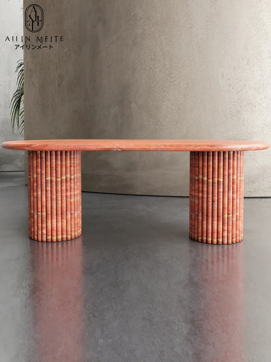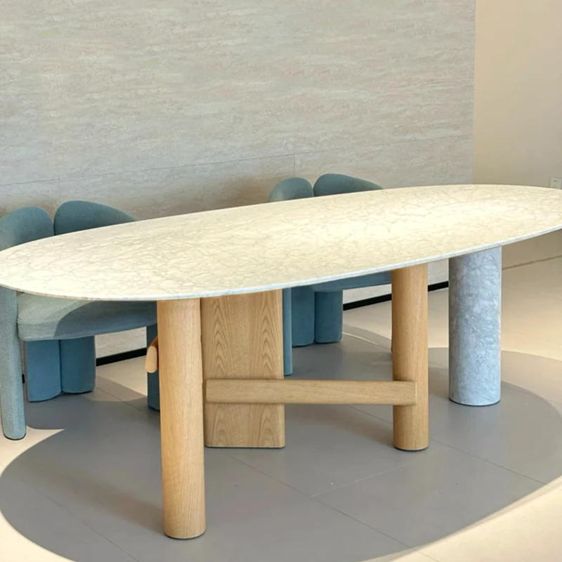 レトロシックな天然石のダイニングテーブル - フランス風のライトラグジュアリーでミニマルなデザイン、エレガントな楕円形の大理石テーブル。ヴィラの食卓にぴったりな高級感あふれるアイテムです。