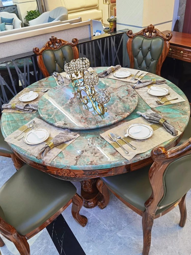 天然ブルーサンド円形ダイニングテーブル - 高級デザイン、ラグジュアリーな石材使用、洗練された大平层別荘にぴったりなテーブル&チェアセット、ミニマルな美しさを追求。