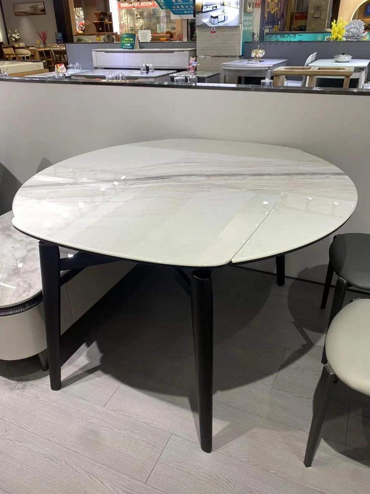 大理石デザインの伸縮式ダイニングテーブル - 実木製でモダンな小型空間向け、円形と長方形に変形可能!家族や友人との食事に最適なスタイリッシュなテーブルです。