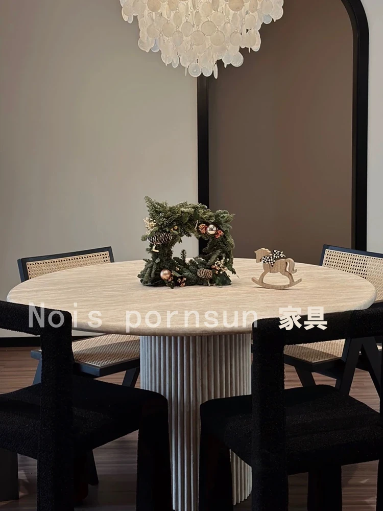侘寂風の軽やかな高級感!北欧スタイルのミニマリストデザイン、天然ローマ洞石のラウンドダイニングテーブル。小さなスペースにぴったりな、創造的で洗練された食卓をお楽しみください。