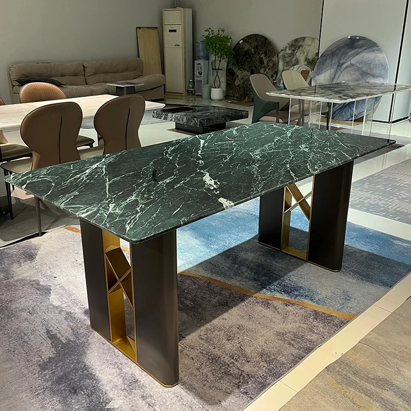 イタリアンミニマリズムの大理石高級ダイニングテーブル|ラグジュアリーなリビングにぴったり!天然カルイアイスジェードの長方形デザインで、エレガントな食事空間を演出します。